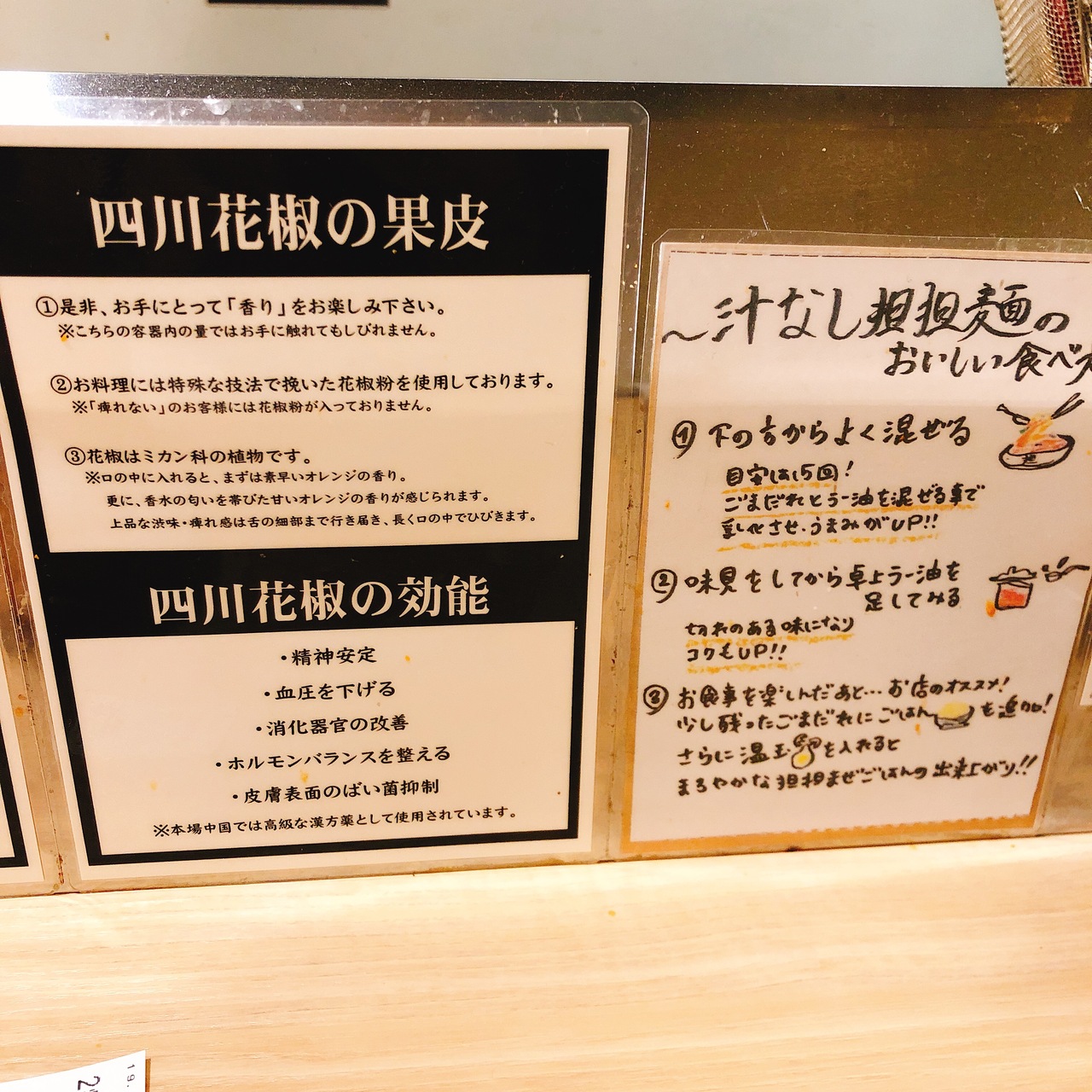 汁なしの坦々麺をいただきましたが、山椒の痺れ感が良くて美味しかったです。辛さの度合いやトッピングも選べます。