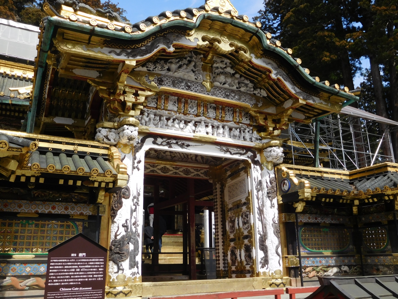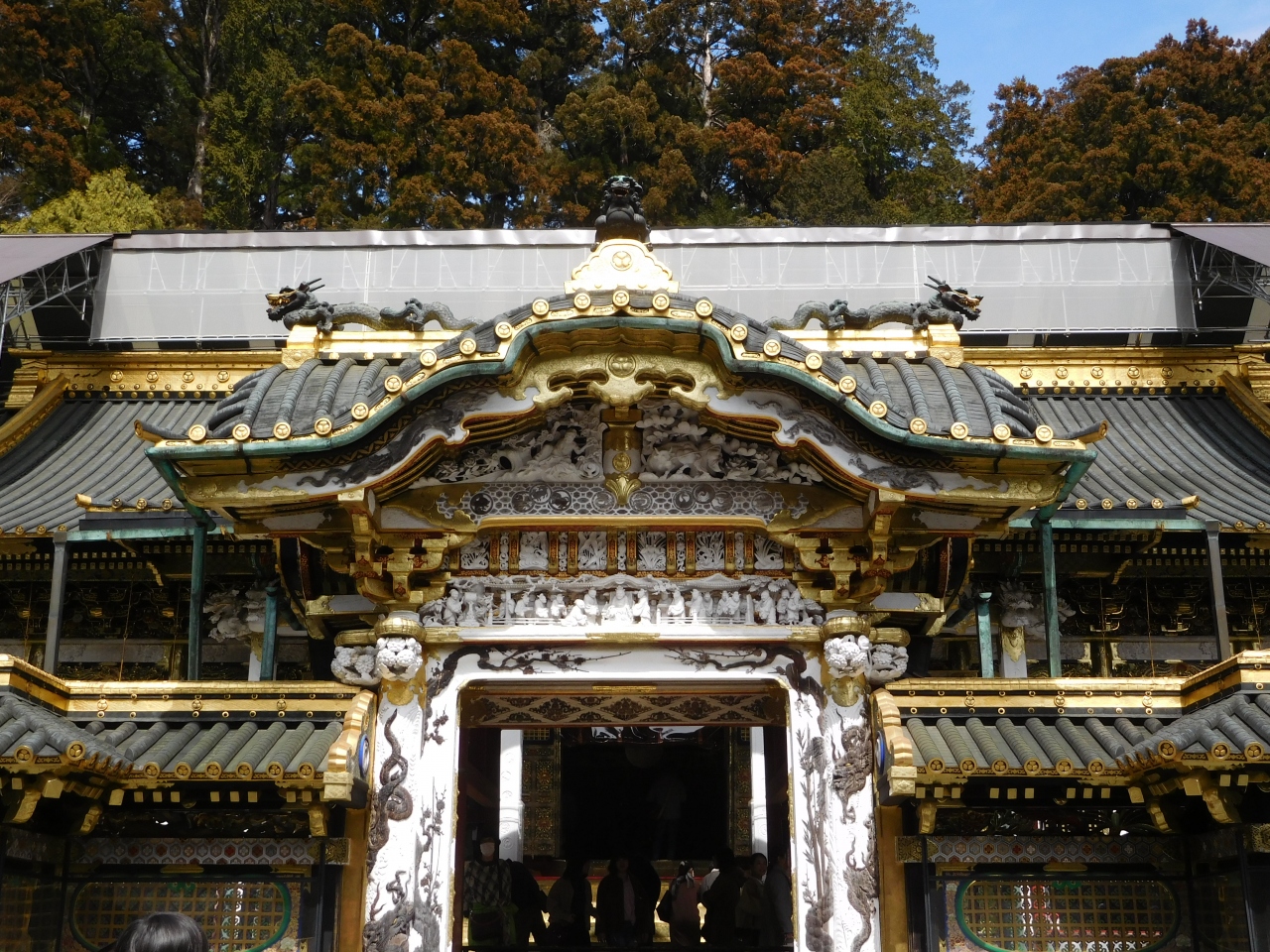 日光東照宮の陽明門の先にある、本社(拝殿・本殿)の表門です。特別な儀式の時にしか開かれない門の為、通り抜ける事が出来ないようになっています。白と金色を基調とした豪華な造りになっていて、門の柱には寄木細工で造られた「昇竜」と「降竜」の姿があり、上部には「舜帝朝見の儀」を表した白色の彫刻がありました。「平成」は、この舜帝の言葉である「内平外成」を出典としているので、平成の時代が終わる前に見に来る事が出来て良かったと思いました。