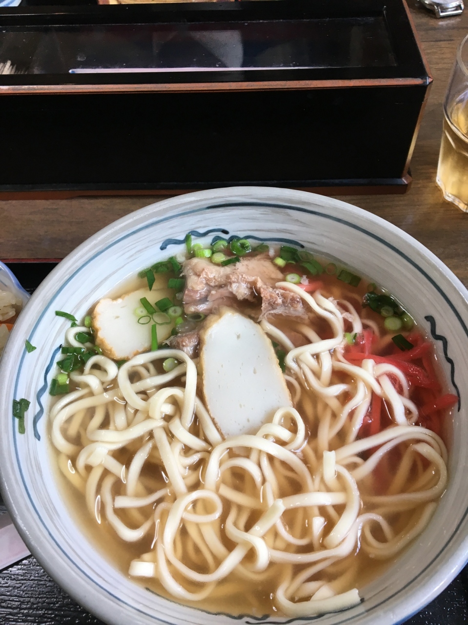 ゆいレール旭橋駅から徒歩3分程度の場所にある沖縄ソバのお店。入り口で食券を買ってから席に着くタイプです。メニューは沖縄ソバ、本ソーキそば、軟骨ソーキそばのほか、ぜんざいもありました。そばは大、並から選びます。机には沖縄ソバによくある紅しょうがとコーレグースが置いてありました。ランチタイムはソバを注文するとジューシーか、おいなりさんが無料のサービスがありました。スープは程よい塩加減で出汁からも良い感じ。軟骨ソーキは軟骨部分までトロトロに煮てあり、量も多過ぎず、少な過ぎずちょうど良い感じでした。強いて言えば、麺の感じが個人的には好みのタイプではありませんでした。若干粉っぽいというかなんというか。でも全体的には満足の沖縄ソバでした。