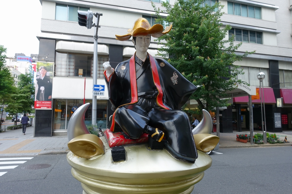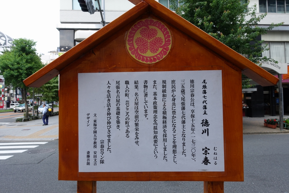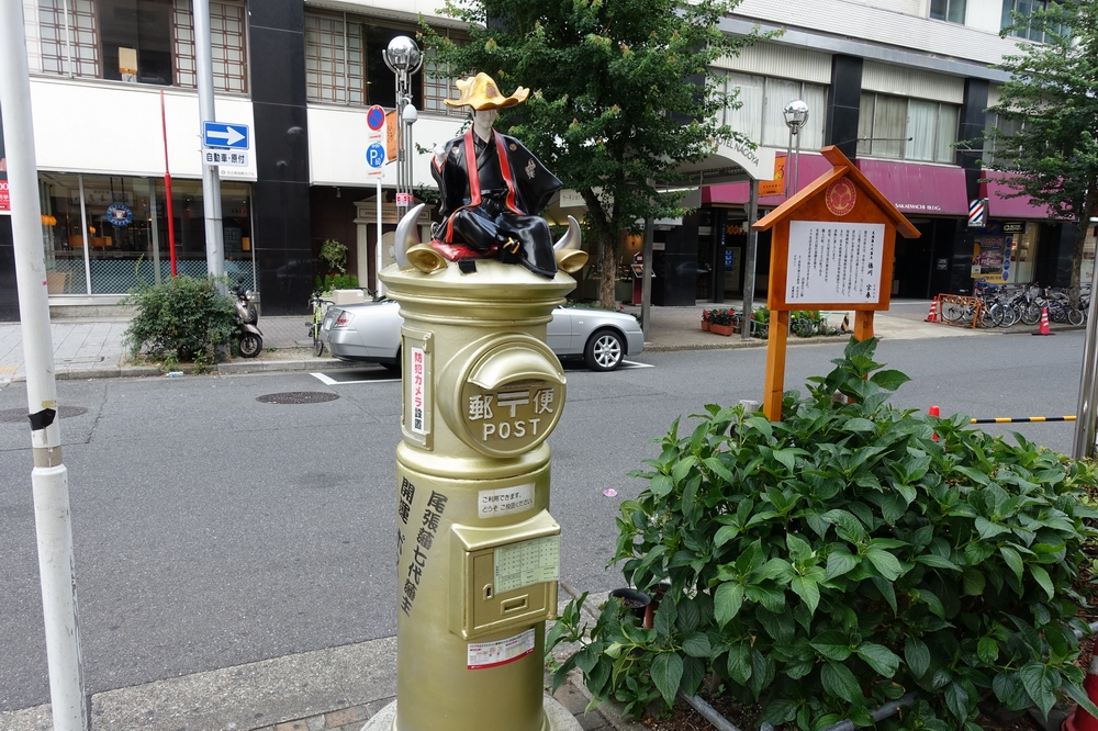 金色の丸型ポストです。ポストの上に尾張藩七代藩主徳川宗春の人形が乗っていて、なんともユニークで目を惹きます。規制緩和、開放政策を行なった人物らしい堅苦しくない風貌の人形で、さらによく見るとポストにはツノと耳のようなものも付いていました。