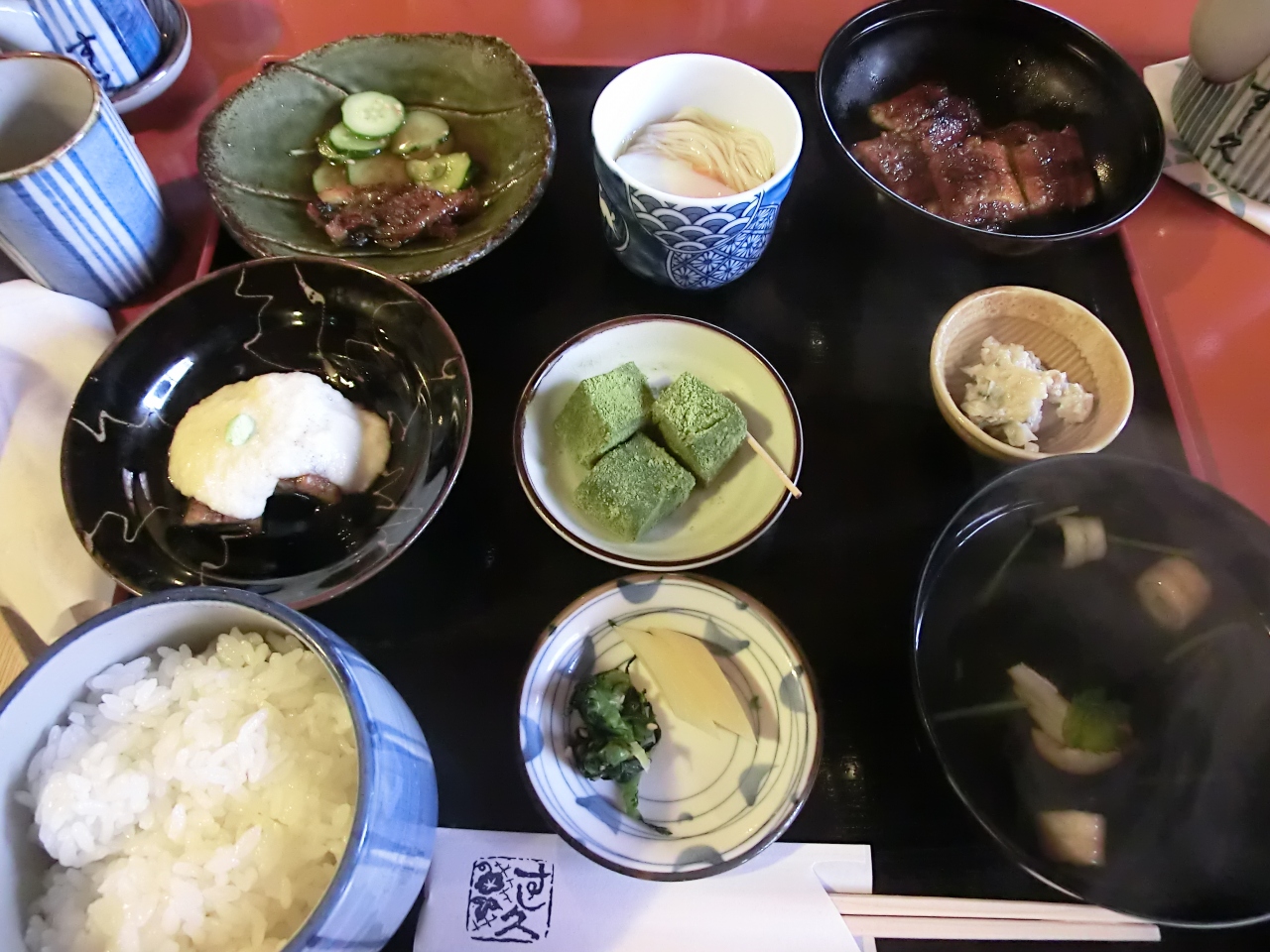 伊勢神宮へのお参り途中、参道にあったすし久とうお店でお昼にした。名物はてごね寿司らしいけど、私は鰻膳を注文。ごはん、吸い物、とろろ、つくだに、漬物、鰻3切れくらい、わらびもちなどがついて3000円近く払った。味は美味しいけど、ちょっと高すぎ。