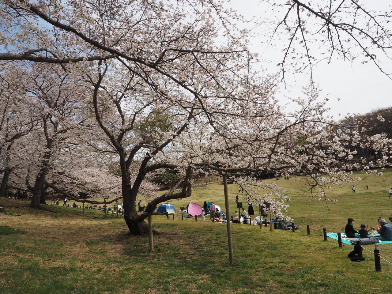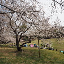 今もゴルフ場の名残が残る広い芝生の公園で、高台の斜面には桜の高木がたちならび、桜の時期は一面ピンク色に染まって見事な光景を見せてくれます。