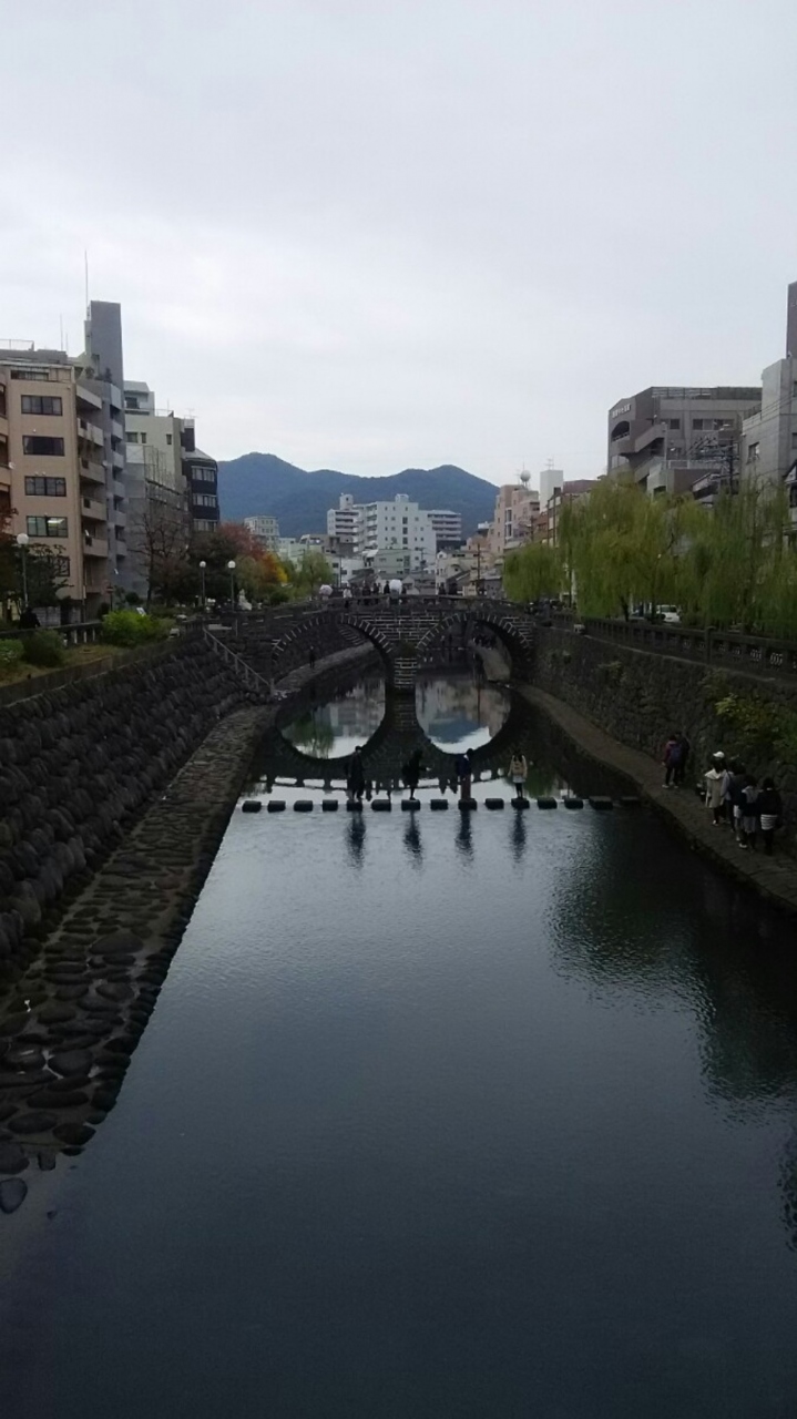 学生さんたちが橋をバックに飛び石の上で写真を撮っていました。インスタ映えするポイントなのでしょう。