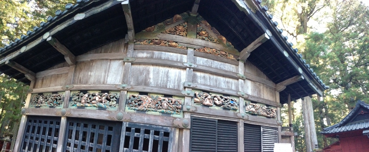 有名な3匹の猿がこちらの建物に刻まれてます。写真付きの解説もあってわかりやすい。