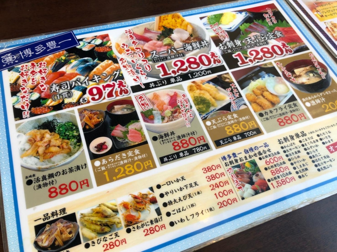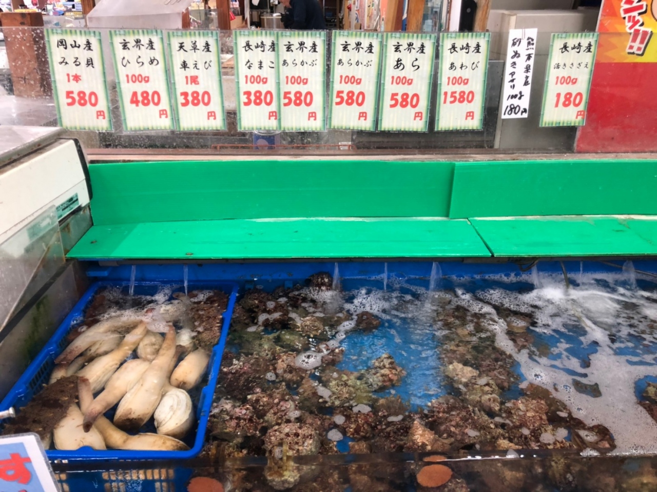 博多湾に面したベイサイドプレイスのB棟一階にある新鮮な魚介類を販売もし店内で料理が食べられるお店です。訪れた当日は家族で博多湾観光をしている時、ランチタイムで食事をしました。店内の生簀には沢山の魚介類が販売していてお得なお値段です。