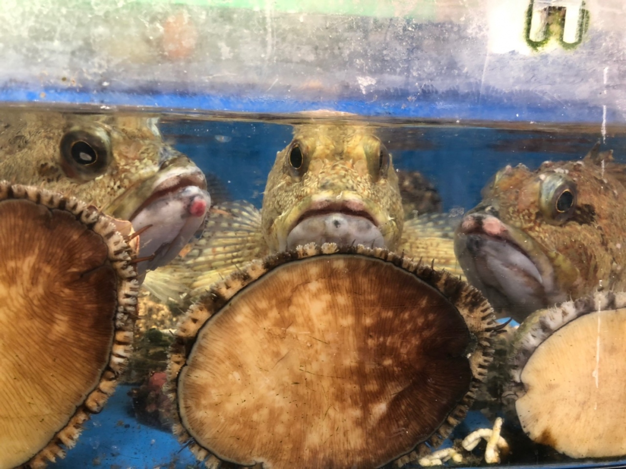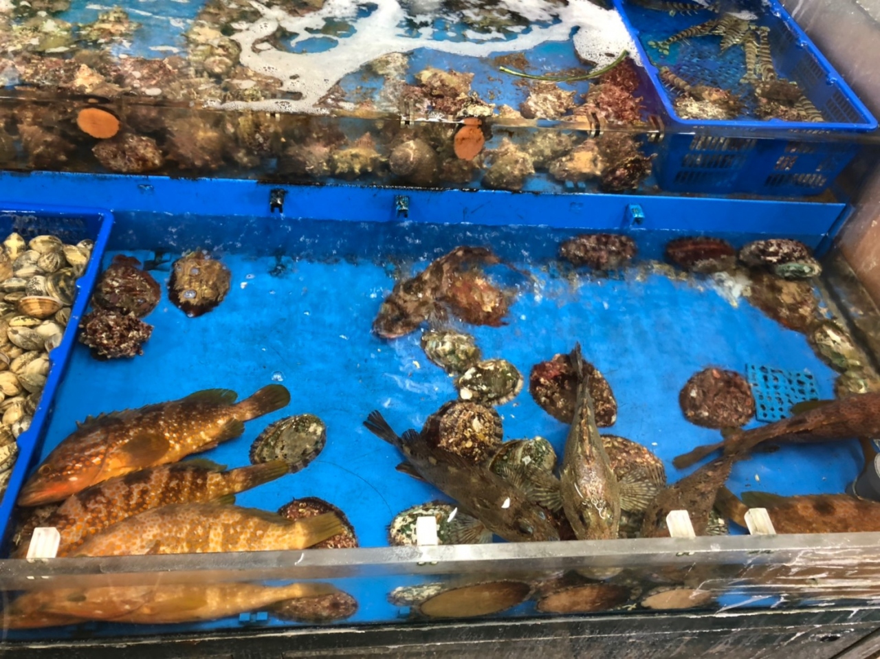 - 生簀に沢山の魚介類をリーズナブルで販売しています