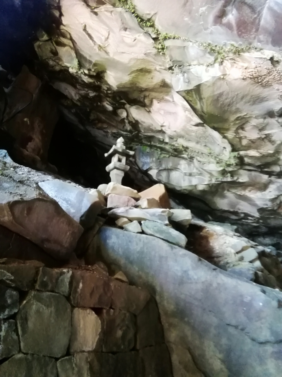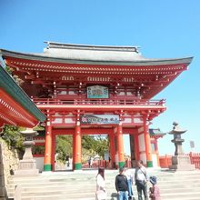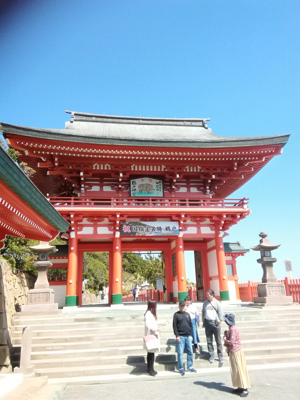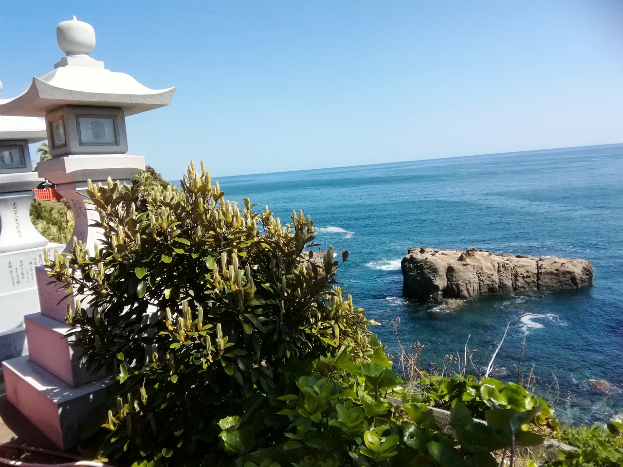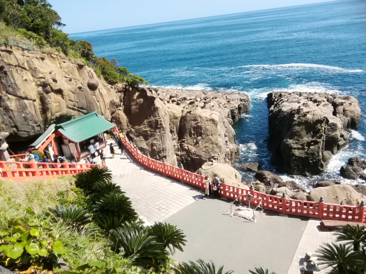 太平洋沿いの崖っぷちに立つ鵜戸神宮に立ち寄りました。駐車場から海沿いの参道を10分ほど歩くのですがこの日は海と空が真っ青でとてもキレイな眺めでした。社殿は海蝕洞の中にあり、極彩色の見事な彩を見せていました。社殿の入口には願いを込めて投げ、石のくぼみに入ると願いが叶う運玉があります。広島カープも優勝祈願に訪れるこの神宮は、日南観光には欠かせませんね。