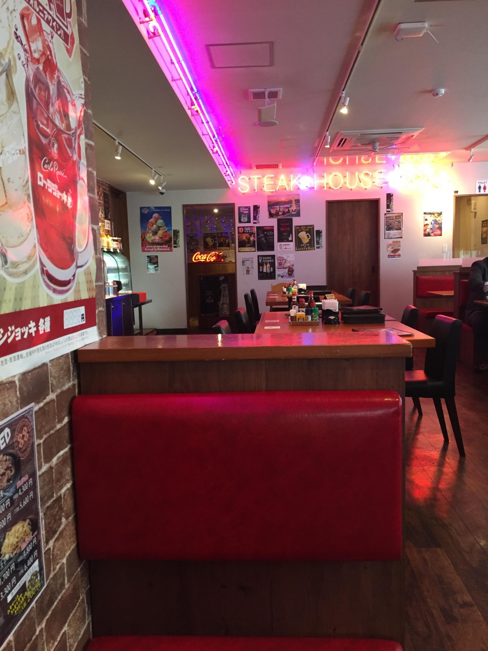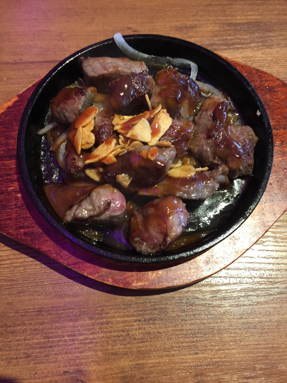 宿泊しているホテルの近くにあり、行ってみました。店内の雰囲気は、アメリカンな感じで個人的には好きです。ごはん・スープ・サラダは、セルフだったと…。今回は、サイコロだか切り落としのようなものを頼みましたが、次回は普通にステーキをオーダーしようと思います。