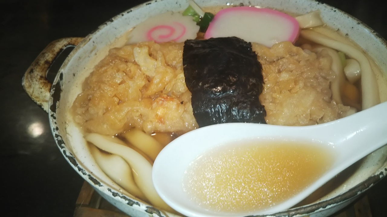 鍋焼うどんを注文、大きな天かすが入っています、丼ものもあり、ガッツリ食べたい人にもおすすめ、食べてる時に次々とお客さんが入ってきて、人気ぶりがわかります。