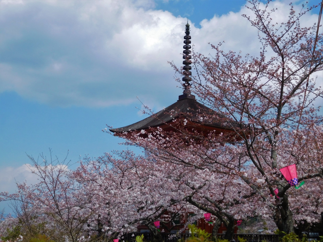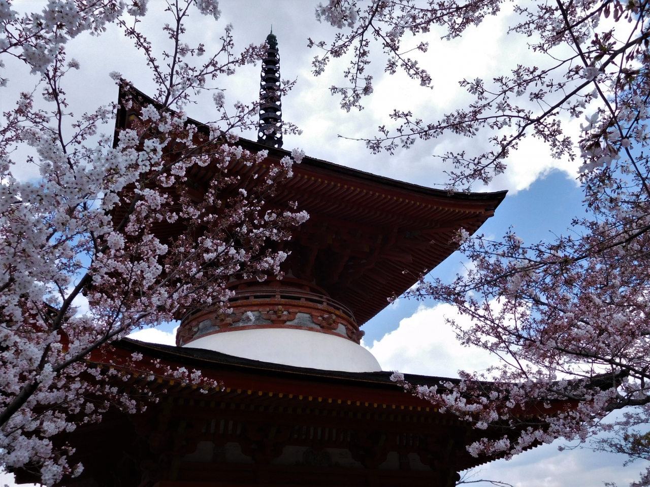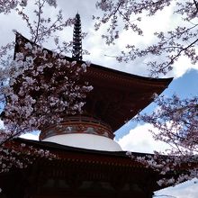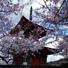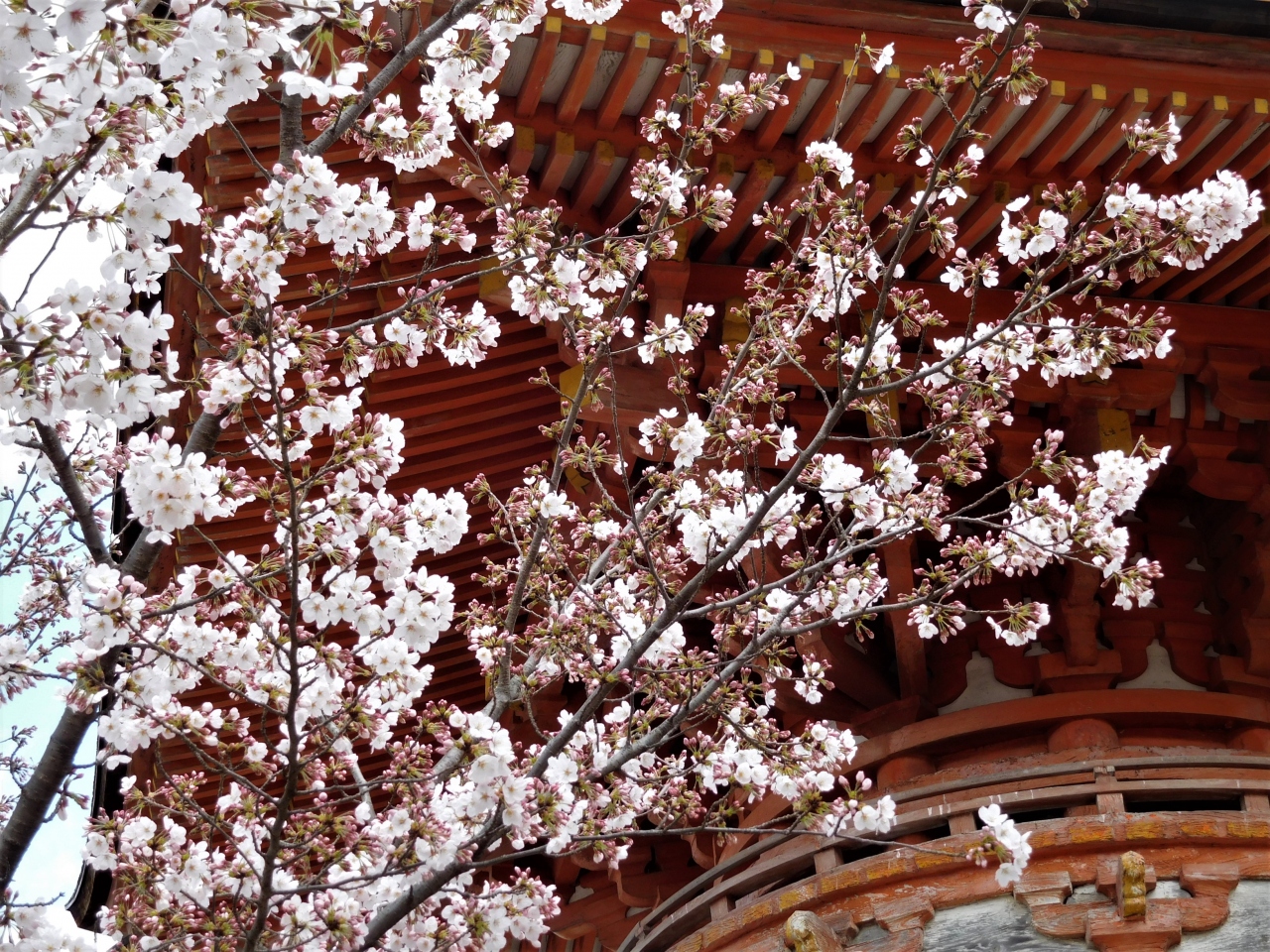 多宝塔の周りには桜が咲いていて、朱色の建物と薄いピンク色がきれいです。