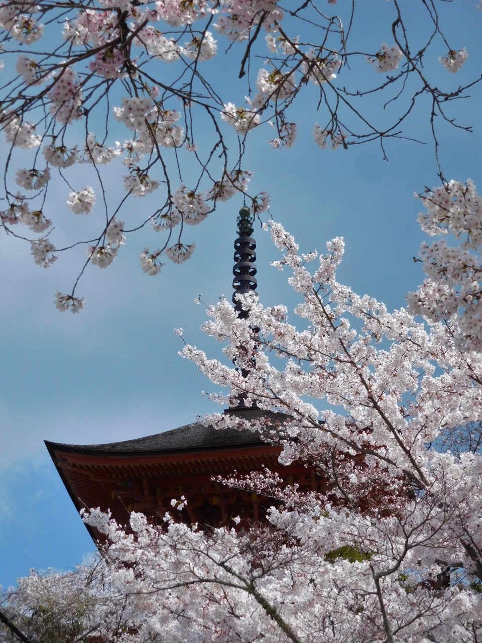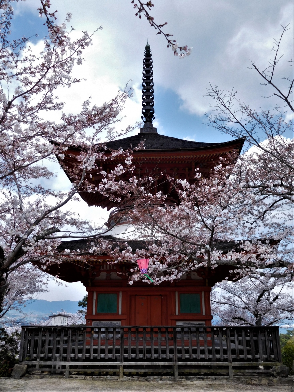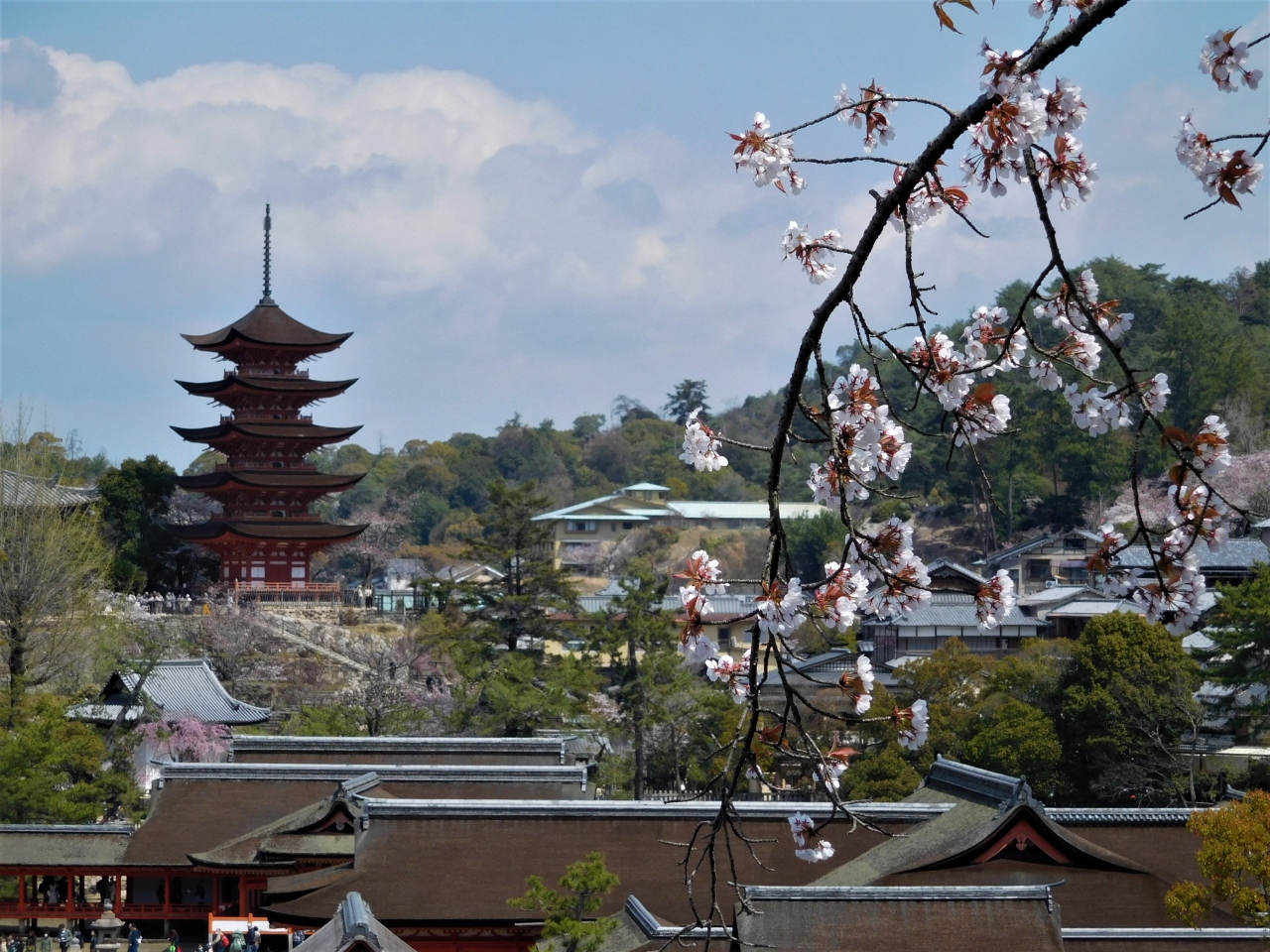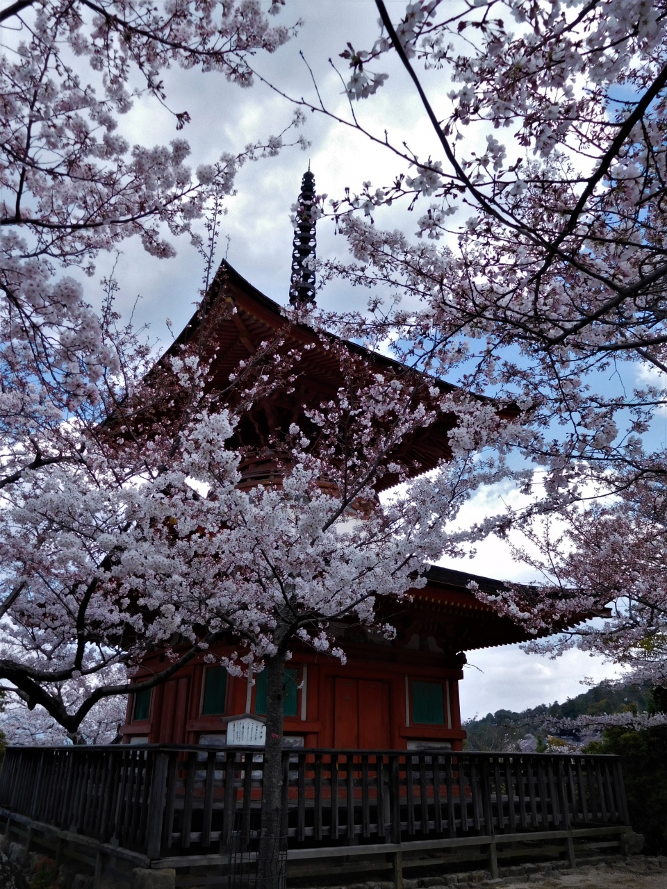 多宝塔の周りには桜が咲いていて、朱色の建物と薄いピンク色がきれいです。
