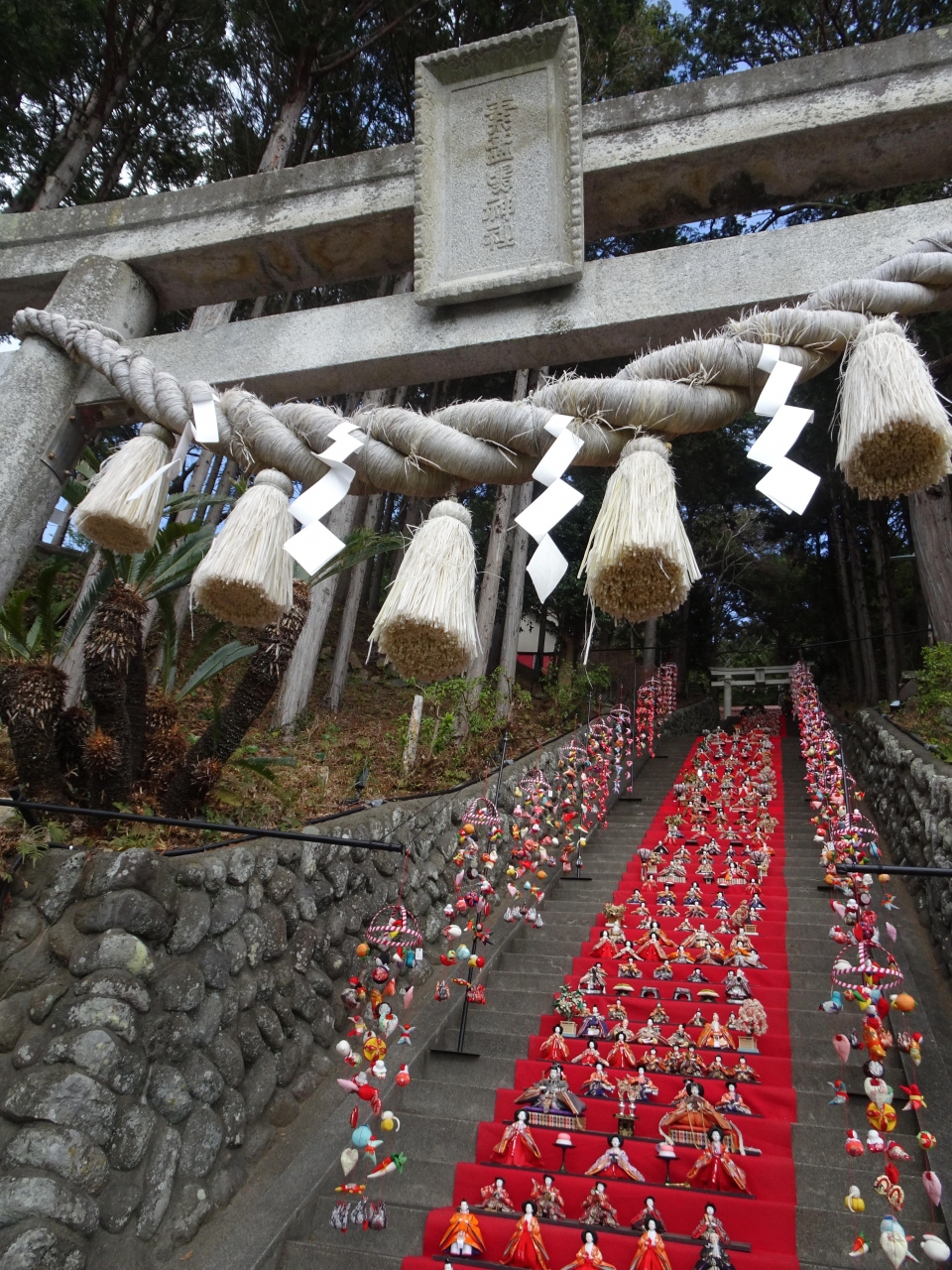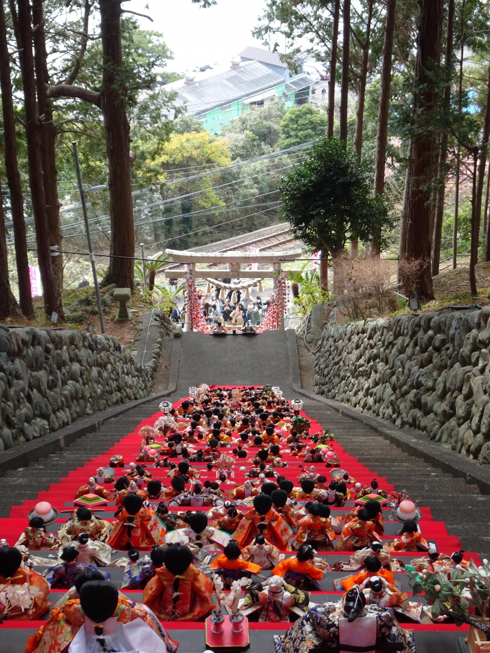 TVや写真では見ていましたが、実際に神社の本殿につながる階段に飾られた雛壇飾りを見ると、その長さに圧倒されました。