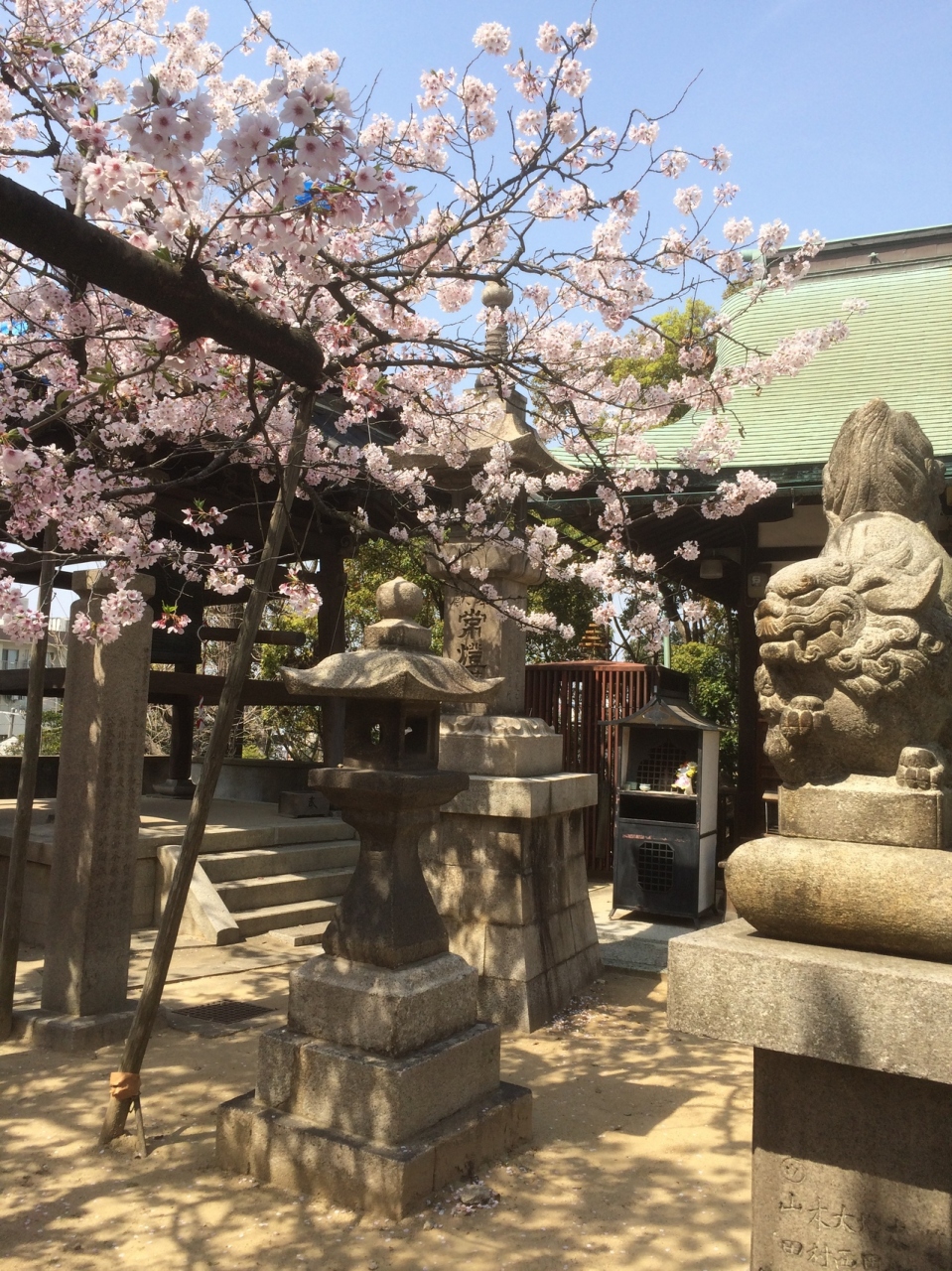 鳥居があったので神社かと思いましたが寺でした。階段を上がって境内です。左側に大きな鐘があり、中央には桜の花が咲き綺麗でした。四方は建物が立っていて少し狭く感じる境内でした。獅子の像が怖い顔をして牙がありました。