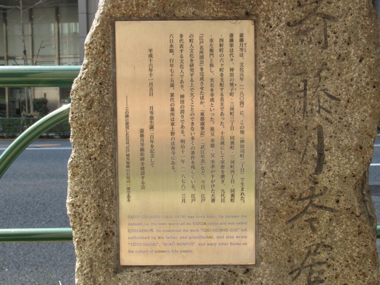 そのためでしょう、この石碑は、平成16年 (2004) に生誕二百年を記念して、斎藤月岑顕彰碑を建設する会が、江戸城外堀跡の石垣の一部を使用して建てたもので、ここ神田の誇りにしていることが窺えます。