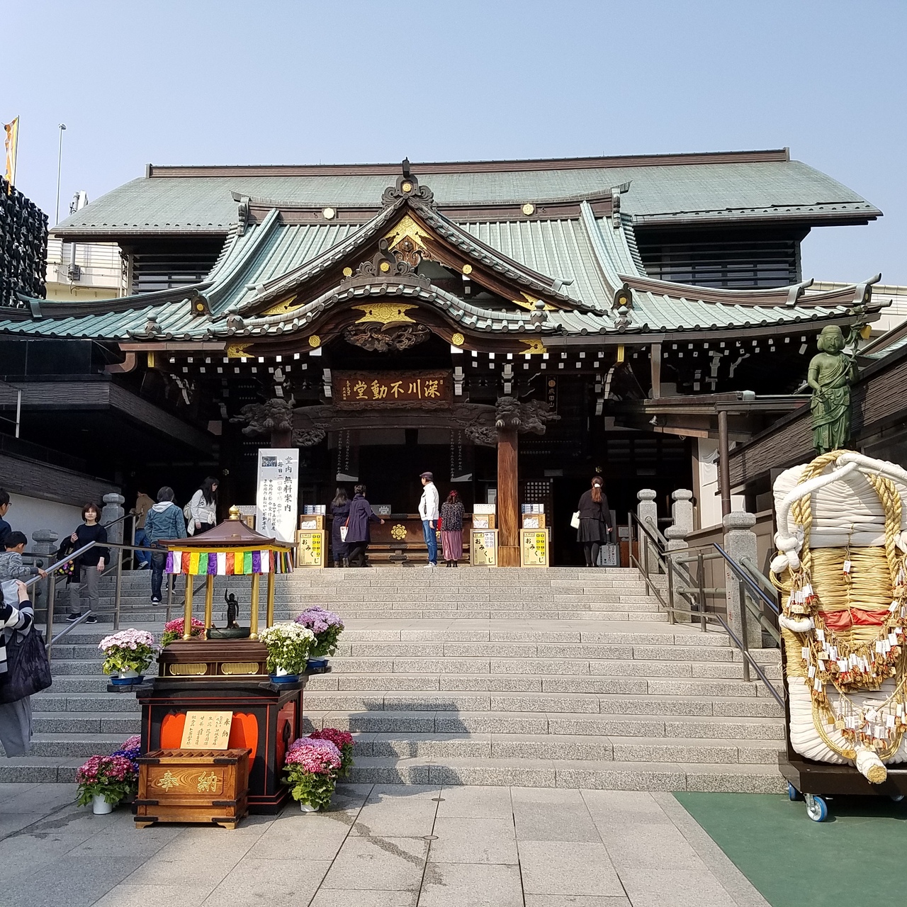 赤い大きな鳥居をくぐり抜け暫く「人情深川ご利益通り」進むと不動堂が見えてきます。