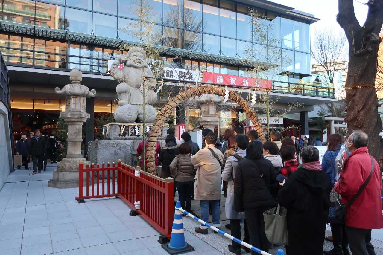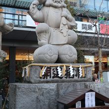 神田明神の境内、隨神門を潜った先すぐの文化交流館の前にある大きなたいこく様の石像です。1月の三連休に神田明神を訪れると、だいこく様尊像の前は長蛇のお参りの人。御神殿の前の列に次いで並んでます。米俵の上に乗り小槌を振る可愛い顔をした大黒様の像は並ぶだけのご利益をきっと授けてくれます。