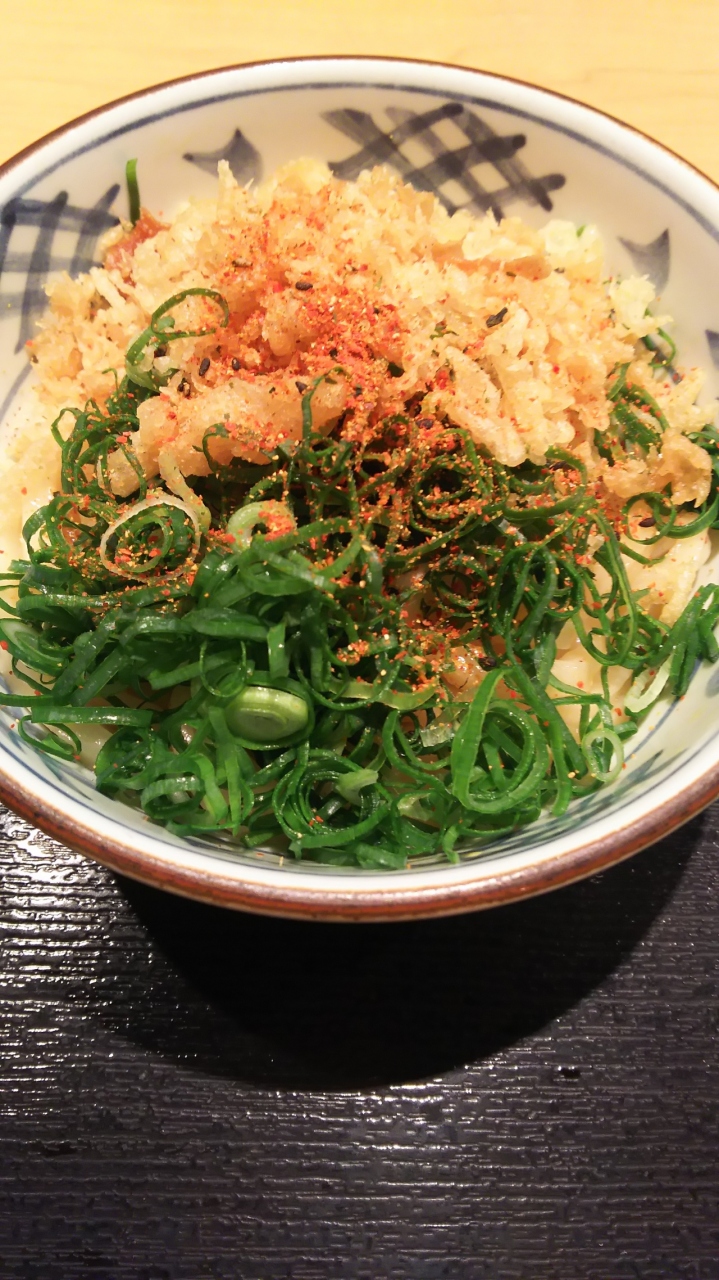 ネギや天かすがセルフサービスでかけ放題なのがうれしいです。