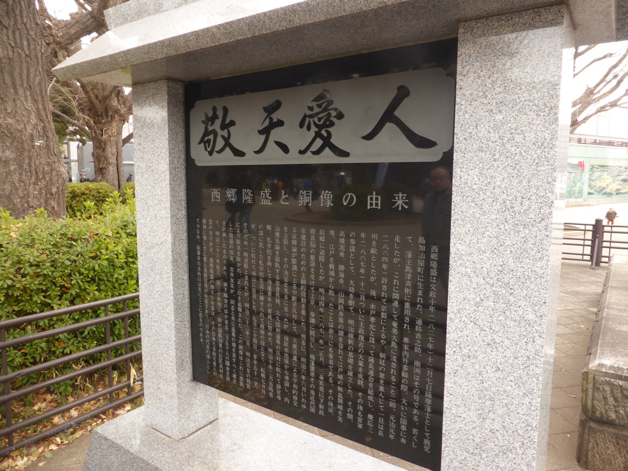 上野公園の入り口から階段を上りすぐの場所にあります。西郷隆盛像を見たのは初めてで、思っていたより大きく感じました。似ているのか似ていないのかは知る由もありませんが、すでにこの顔で定着しており今や上野のシンボルと言ってもいい存在。皆に親しまれ記念写真を撮るスポットになっています。(西郷隆盛の事を知らないであろう外国人にも人気です。)ただ記念写真を撮るだけではなく、是非横にある石碑「敬天愛人」にも目を向けて頂きたいです。