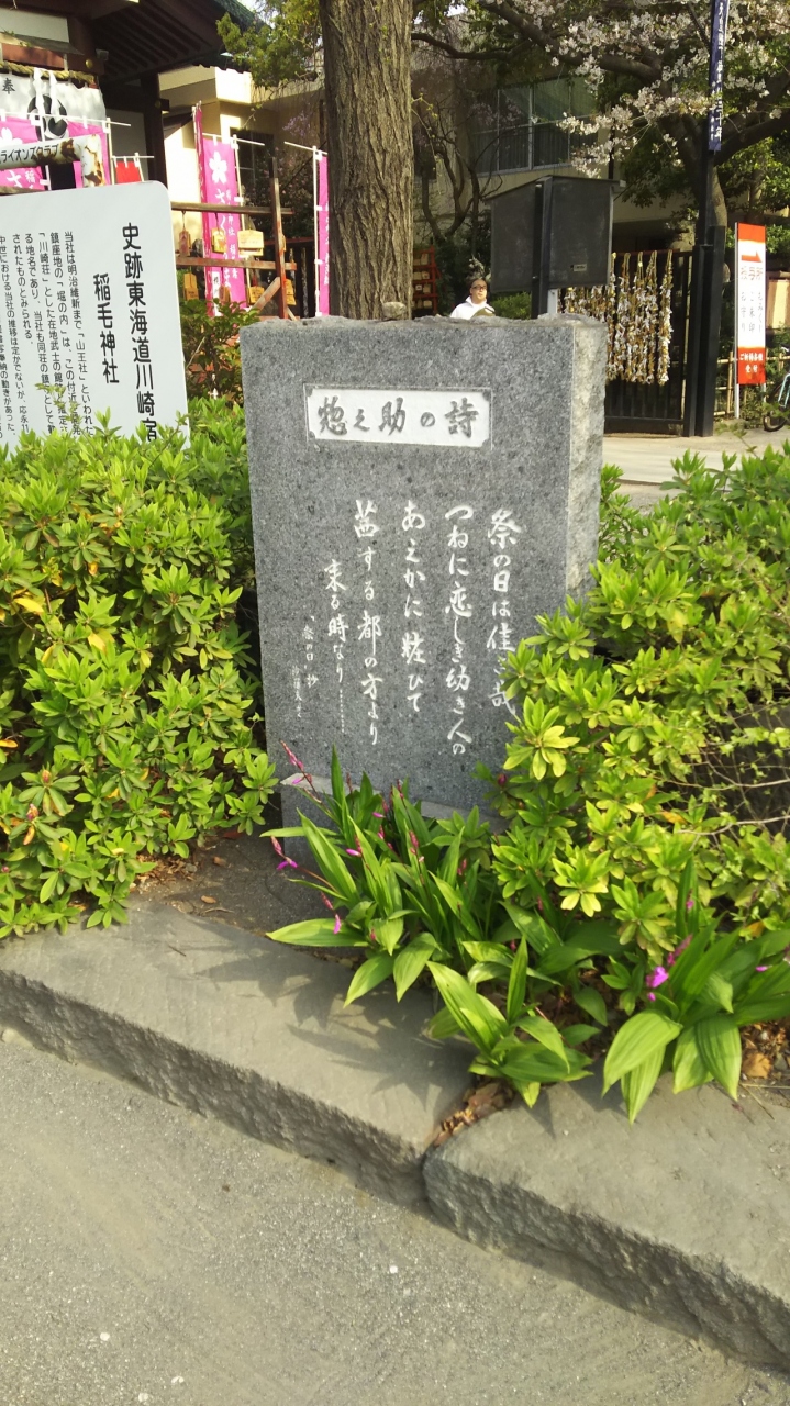 あまり知られていないですが、川崎出身の詩人の佐藤惣之助の祭りの日という詩の石碑です。稲毛神社の境内にありました。
