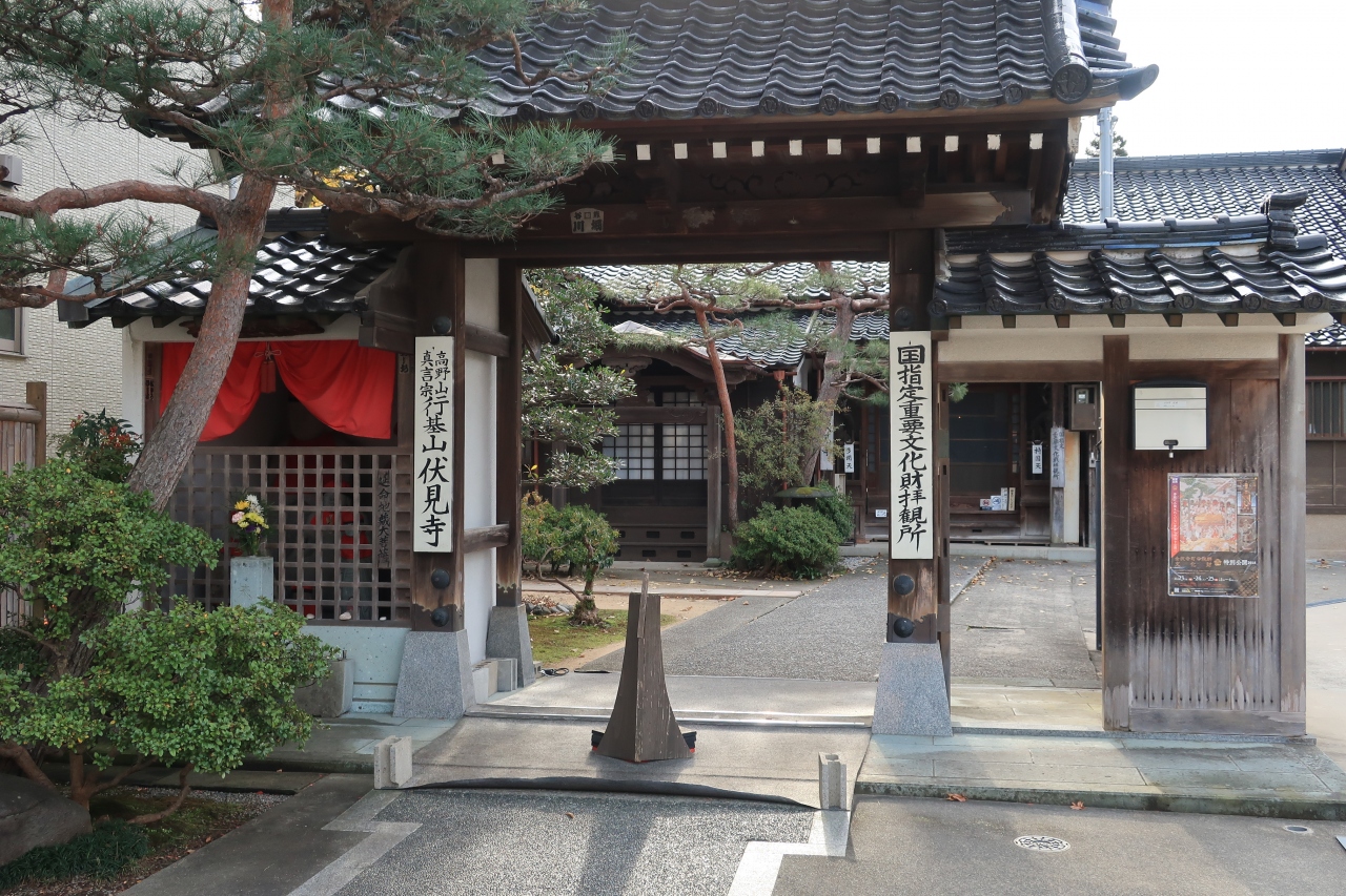 寺町寺院群の中にあるお寺だ。「国指定重要文化財拝観所」の看板が門に掛かる。今でいう金山師の芋堀藤五郎が金で築いた富でこの伏見寺を建立。この地にいた行基が開眼法要を行ったことで、行基山を名乗るようになったという。籐五郎は兼六園にある金城霊沢でも聞く名前だ。籐五郎は掘り出した砂金を金城霊沢で洗っており、後年、その名を縮めて「金沢」の地名が付いたという。ここに立ち寄る前に兼六園で金城霊沢の説明を見聞していたので話がつながった。山門をくぐってすぐところに籐五郎の墓がある。有料だが、重要文化財の阿弥陀如来像は必見だ。