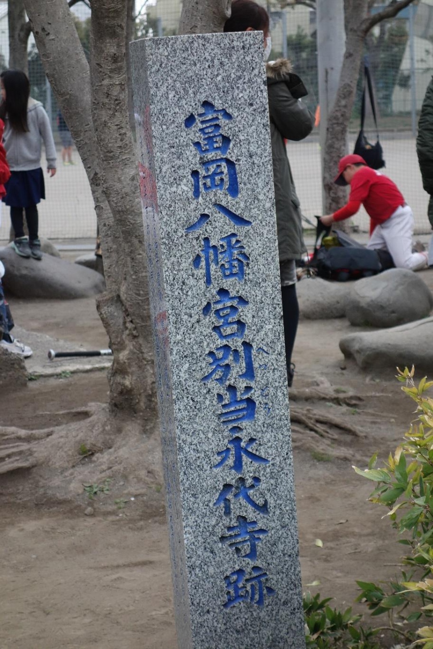 深川や木場あたりのエリアを散策中、深川公園を訪れた際こちらを見学しました。子供や家族連れでにぎわう公園内の野球グランドの近い場所に石碑が置かれていました。近くの富岡八幡宮の別当として創建された寺院だそうです。