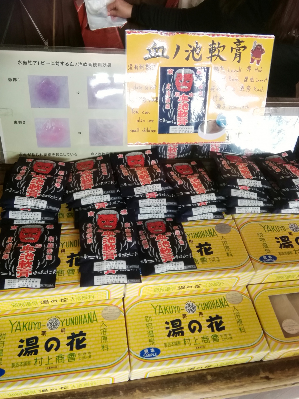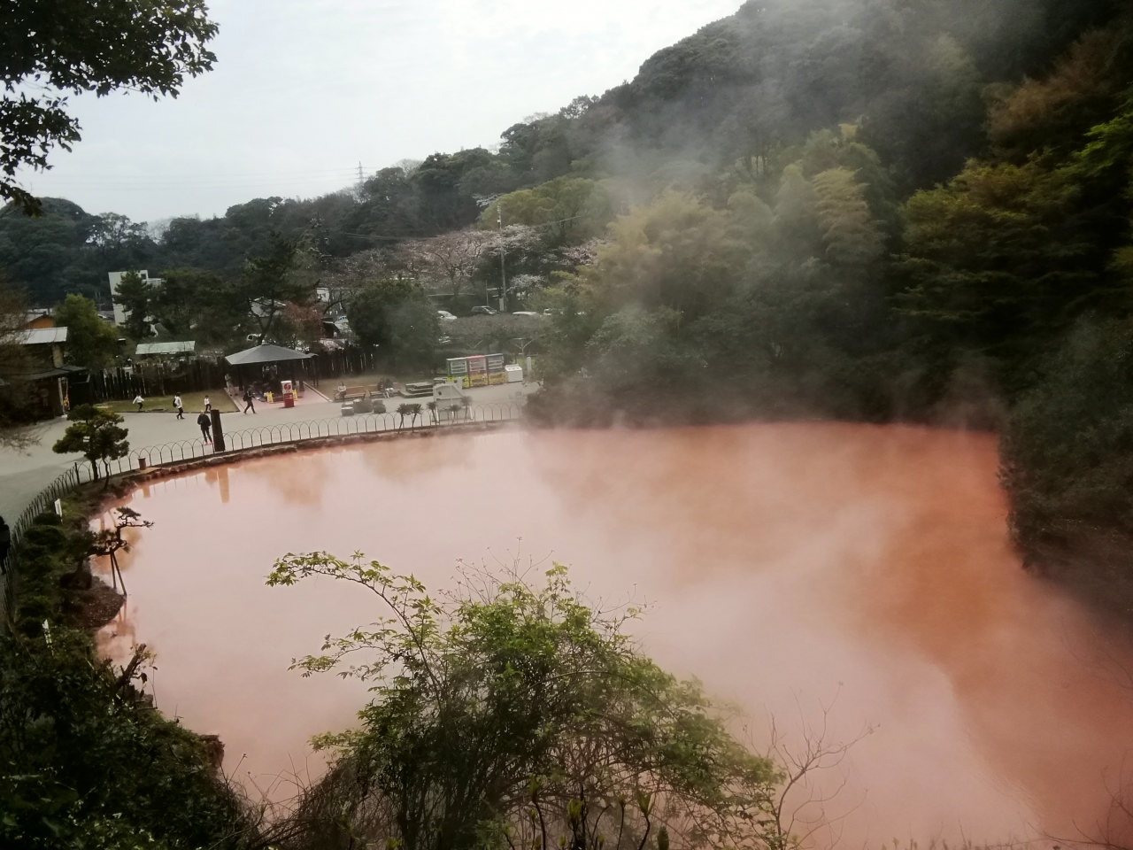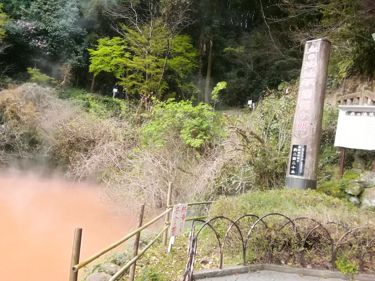 他の地獄からちょっと離れた場所にあるのがこの地の池地獄です。名前の通り、酸化鉄や酸化マグネシウンムを含むため血の色のように赤くなっている温泉です。池の横にはこの池からとった粘土で作られた皮膚病に効く軟膏を販売していたり、足湯やお土産コーナーもあります。