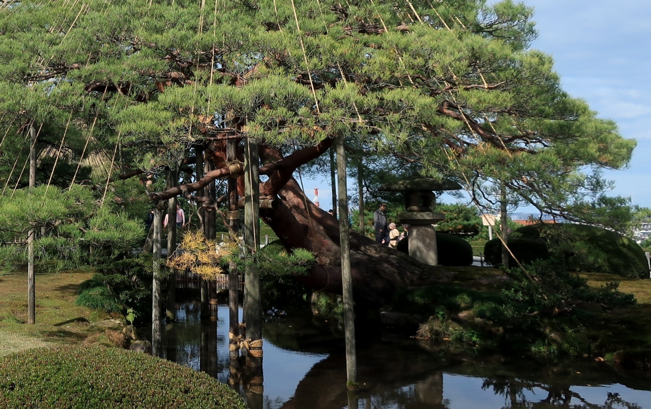 兼六園を代表する風景の一つ、唐崎松の木陰にある灯籠だ。石材は御影石で、笠は直径2メートル弱。円形の火袋が特徴だ。この灯籠を見ると、旅というのは事前に調べておかないと楽しみが半減するとしみじみ思う。あらかじめわかっていないとこの灯籠は見逃してしまう。