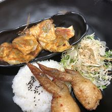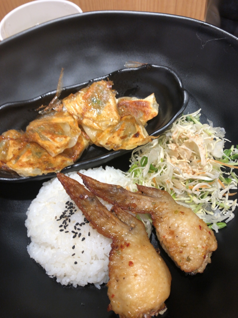 大阪で有名な餃子屋さんの様ですね。イートインで食べれる店は新大阪のみみたいです。ランチプレートを注文。小さい餃子たくさんと手羽先餃子、ごはん、サラダ、スープ。1188円かな?男性には物足りないかと思う。ちょっと割高です。接客は良かったです