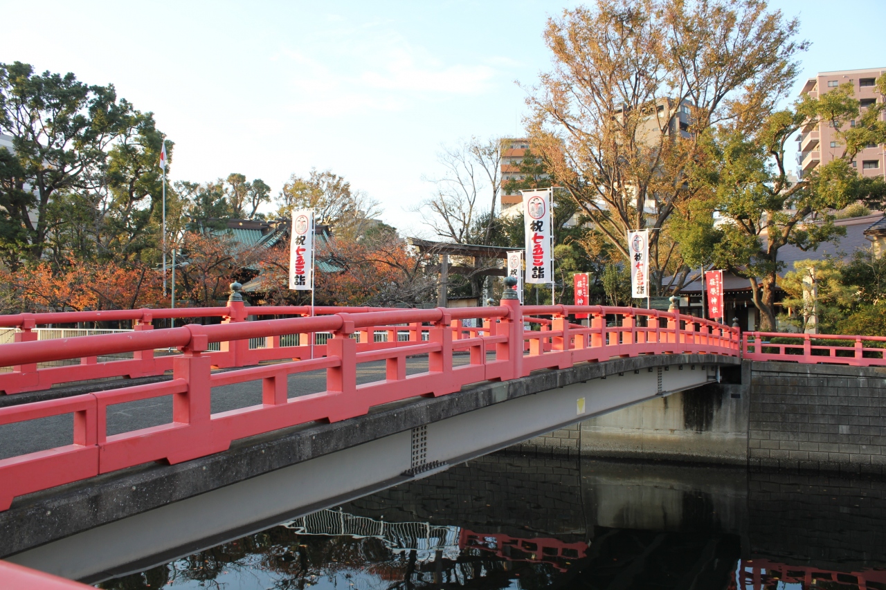 目黒川に架かる赤い鮮やかな橋を渡ると、荏原神社の立派な鳥居と恵比寿様が笑顔で迎えてくれます。
