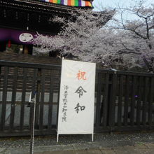 八坂神社から円山公園を抜けて行くと、広い敷地の浄土宗の総本山の”知恩院”に行けます。京都は桜の時期で、ここにも桜を見られました。夜になるとライトアップがあり、有料で見学できます。令和の立て看板があり、早々の案内に驚きましたが。
