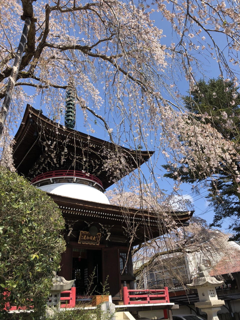 丸い多宝塔と、そのすぐ横の枝垂桜との対比が美しいです。