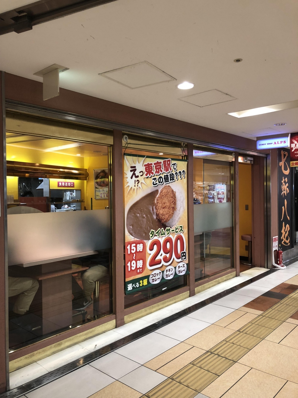 八重洲地下街にあるカレーショップです。元々リーズナブルな価格設定ですが、15時から19時までタイムサービスを実施していて、とてもお得。メニュー限定ながら、かけそば価格でいただくことができます。店内はカウンターのみ。お店の雰囲気に加え、ルーの味も、なんとなく懐かしいといった感じです。客層は男性が大半でした。