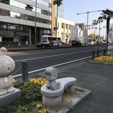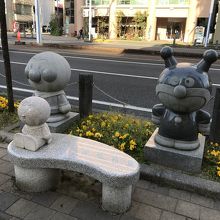作者が高知県出身とのことで、高知市内にはアンパンマン関連のものが多くありました。はりまや橋のすぐ近くのほか、高知駅前の大通り沿いもありました。このスポットでは、ツーショット写真を撮りやすいように、椅子も設置されていました。