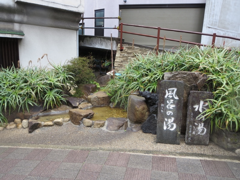 熱海の温泉街へ向かう途中、古い宿の隣りにありました。熱海七湯の一つですが、他の湯に比べると池のようにたまっているようで、温泉が湧いている感じがありませんでした。雨が降っていたこともあり、余計にぬるく感じました。