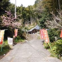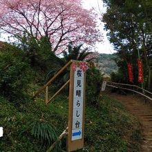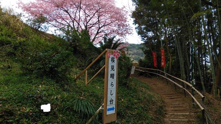 お堂裏手の高台は桜見晴台として開放。川沿いの河津桜の様子が見られて絶景。ここから桜鑑賞をしている人も結構いた。