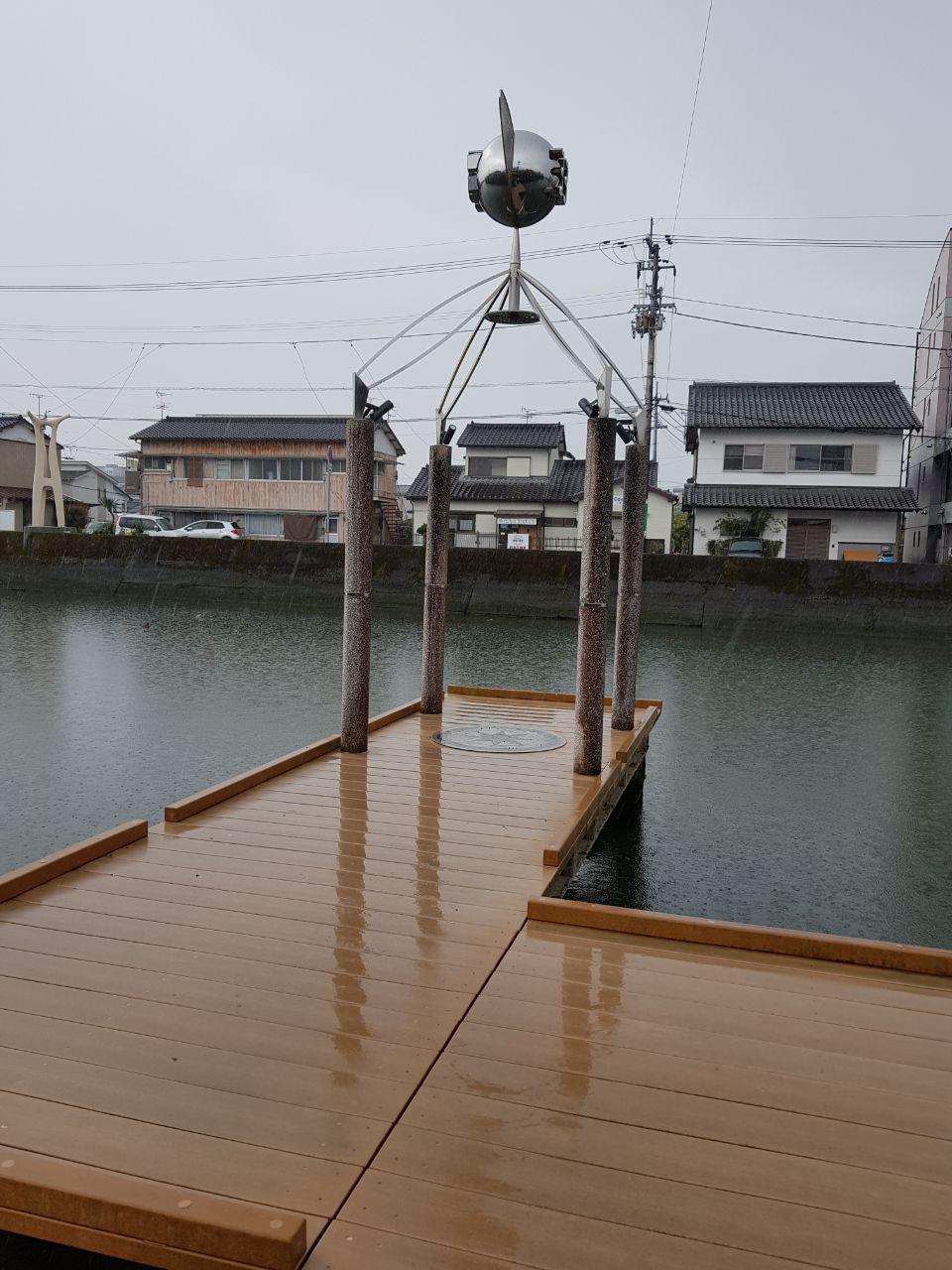 Google Mapを頼りに走り、白いモニュメントが見えたが、銀のモニュメントのほうがそれらしかったので銀のほうに向かった。白と銀は江ノ口川を挟んで対岸に立っている感じ。