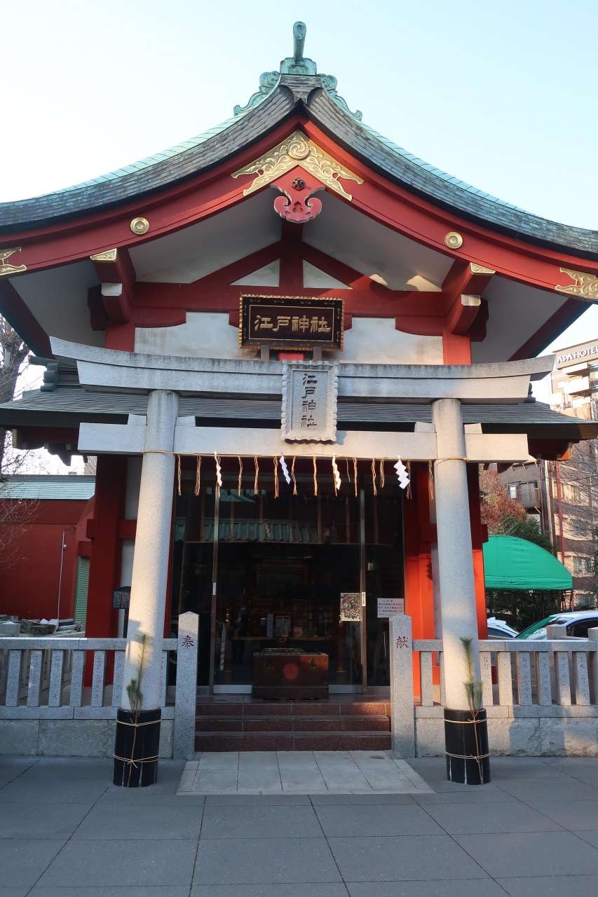 神田明神の本殿を取り囲む様に建立された末社の一つ。祭祀殿・資料館の正面にあるのが江戸神社です。三天王の一ノ宮に数えられる西暦702年以来の江戸最古の地主神です。隣の八雲神社とは異なり、社殿の中をガラス越しで覗けるようになっており、中には金色の装飾が見事な千貫御輿が祀られており見応えがあります。