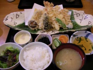 小田原駅のコンコースからエスカレータを降りた2階にある海鮮茶屋魚國があり、店内に入るとカウンター席とテーブル席があり、メニューを見ると日本酒の酒類があり、夜は地元で捕れた魚を出す居酒屋になり、ランチは刺し身や天ぷらの膳があり、上天ぷら膳にすると、小田原港に上がった魚を使った揚げたての天ぷらでした。