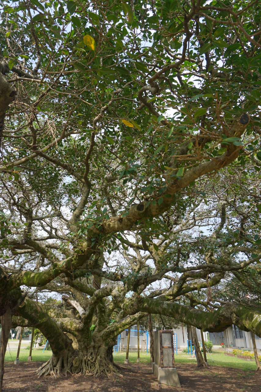 空港のすぐ近く。小学校の正門ちかくの校庭にある大木。後ろを見ると、なっがーい滑り台がある。敷地内は花がいっぱいあり、休み時間で子供たちの元気な声が聞こえ、ほのぼのした観光スポット。ただ駐車場がないので、門の前付近に路駐した。大型観光バスも路駐していた。