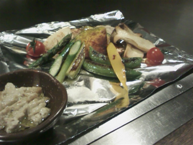 鉄板焼きが気軽に楽しめるお店。テーブル席とカウンター席があって、カウンターに座ると目の前が大きな鉄板になっているので、焼いている姿を見ることができる。出来上がったら、目の前の鉄板部分に置いてくれるので、カウンターの方が好き。普通のお好み焼きと焼きバーニャカウダとチキンソテーなどを注文。どれもアツアツで美味しい。