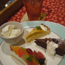 今回、お勧めケーキはフルーツのレアチーズタルトで、かぼちゃとカスタードのタルトとチョコレートケーキを選び、日替わりアイスにはフローズンヨーグルトを選び、ドリンクにはアイスティーを選んだ。