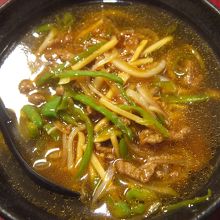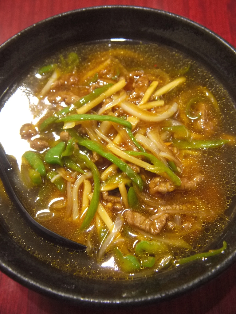 醤油ベースのスープと、チンジャオロースは、意外とよく合う。特に、ピーマンやタケノコのシャキシャキ感は、通常のラーメンにはあまり無い食感。細切りの牛肉もたっぷり入っていて、ラーメンでは一般的な豚肉とまた異なる味わい。