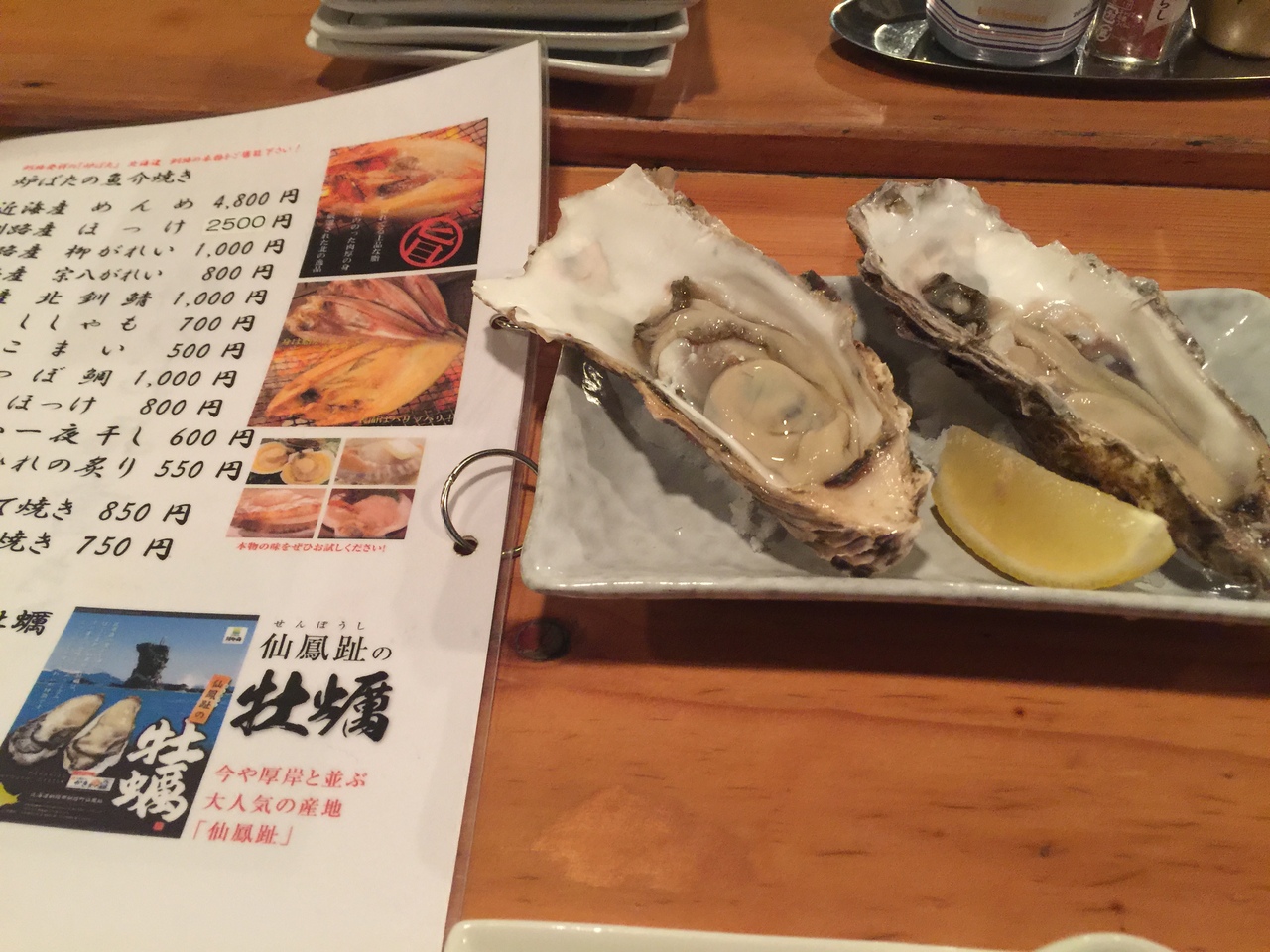 ラビスタ釧路川から歩いて3、4分くらい。店内は炉端風になっていて、カウンター席がぐるっと囲むという感じ。雰囲気を出そうと思っているのか、照明が薄暗くなっているが、ややもの寂しい。しかし、牡蠣は仙鳳趾産でなかなかおいしく、メンメもまずまずでコスパは「ろばた」より良い感じ。