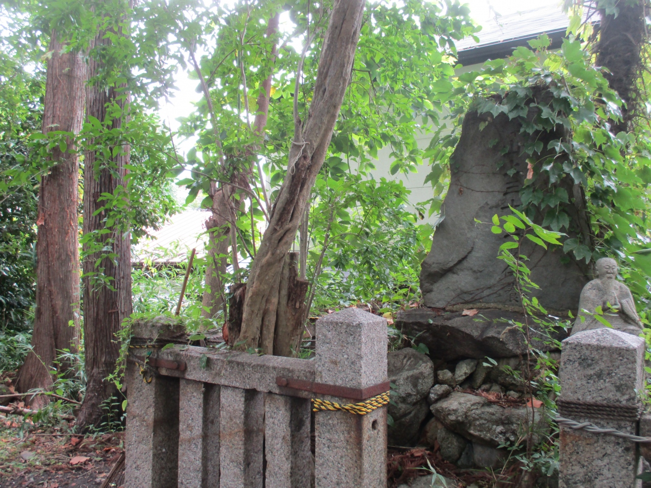 ならまちの可愛い子コンサート会場の音声館の前にあります。石碑か案内板が立っているので、ここが塔の跡だとわかりました。少し奥に入ると、石の柵があってここだとわかりました。石の塊が残っているだけで本当に跡です。ただ謎のおじいさんの石像が何となくユーモラスでした。