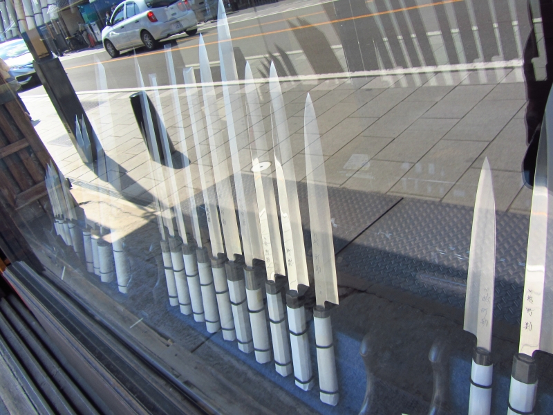 店名だけでは何の店だかわかりませんが、店頭に並べられた大量の包丁を見れば納得。