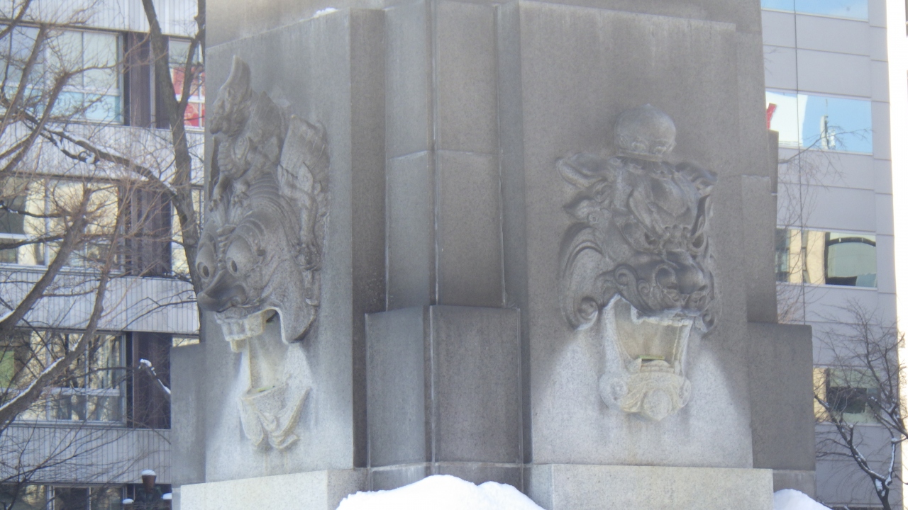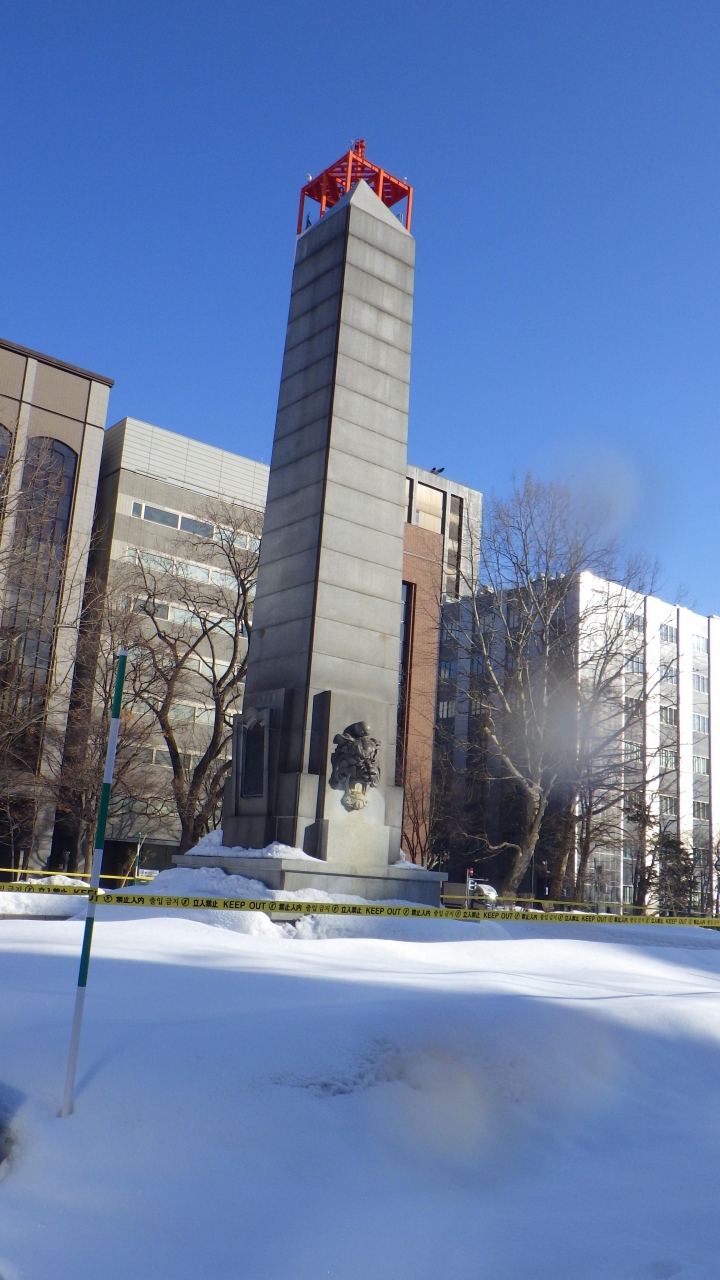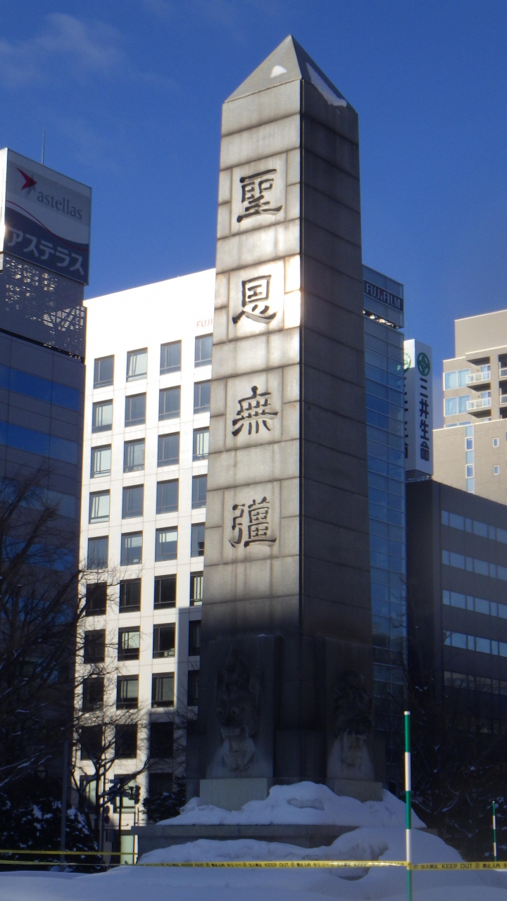 JR札幌駅南口から約1km、大通公園のオアシス西3・4・5丁目水と光のゾーンの西側、大通西5と大通西6交差点の間のゾーンの真ん中に建てられている四角柱の石柱碑です。