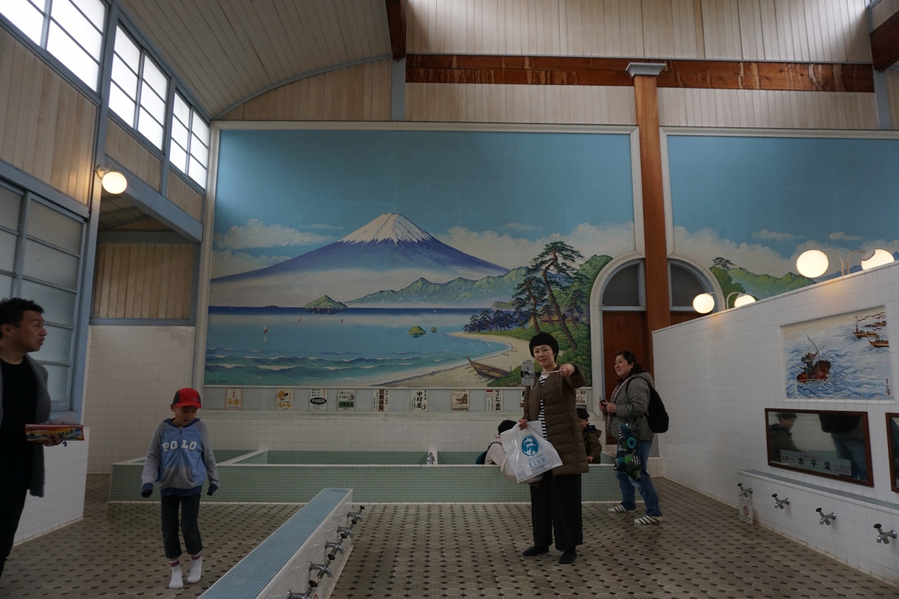 子宝湯は、昭和4年に建った建物。一方の内部は昭和30年代の銭湯の様子を再現したもの。海沿いの松並木の先には富士山やアルプス連峰の眺め。湯船に浸かりながらワイワイガヤガヤ。一日の疲れをここで洗い流す人たちの姿を想像するととても楽しくなる。日本はとってもいい国です。