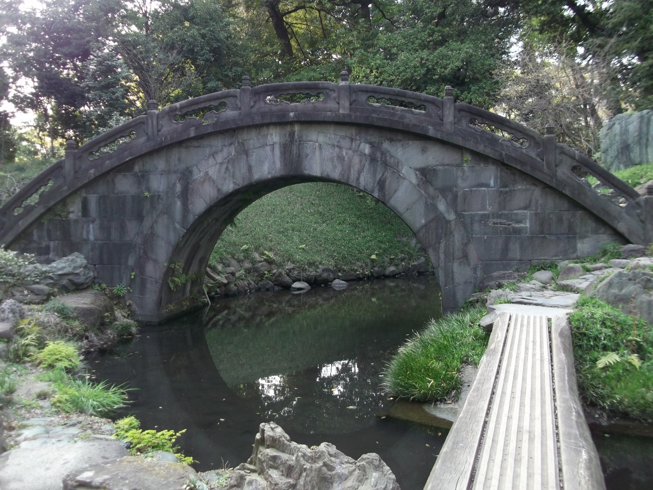 小石川後楽園の北の端近く、きれいなアーチ型をした石造りの橋です。水面に映る姿がちょうどまん丸で満月のように見えることからこのように名付けられたそうです。どことなく中国風の雰囲気が感じられ、情緒のある景観をかもしだしていました。橋自体は眺められるだけで、渡ることはできません。