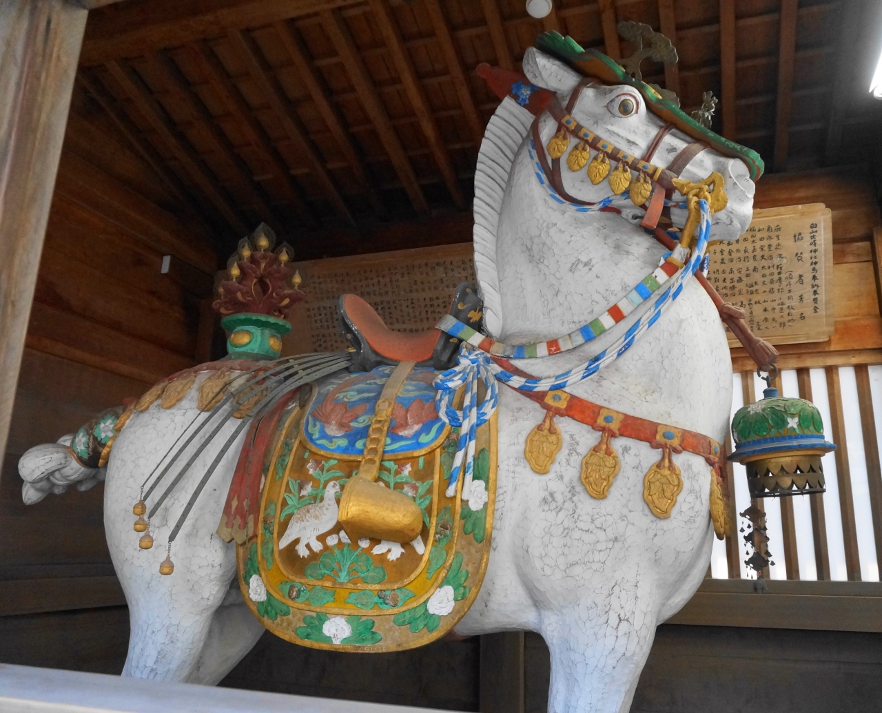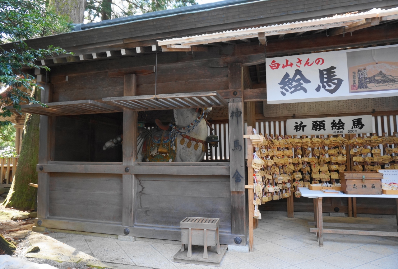 神馬舎の中には、白山比大神を乗せて白山に登拝するといわれる白馬が鎮座します。