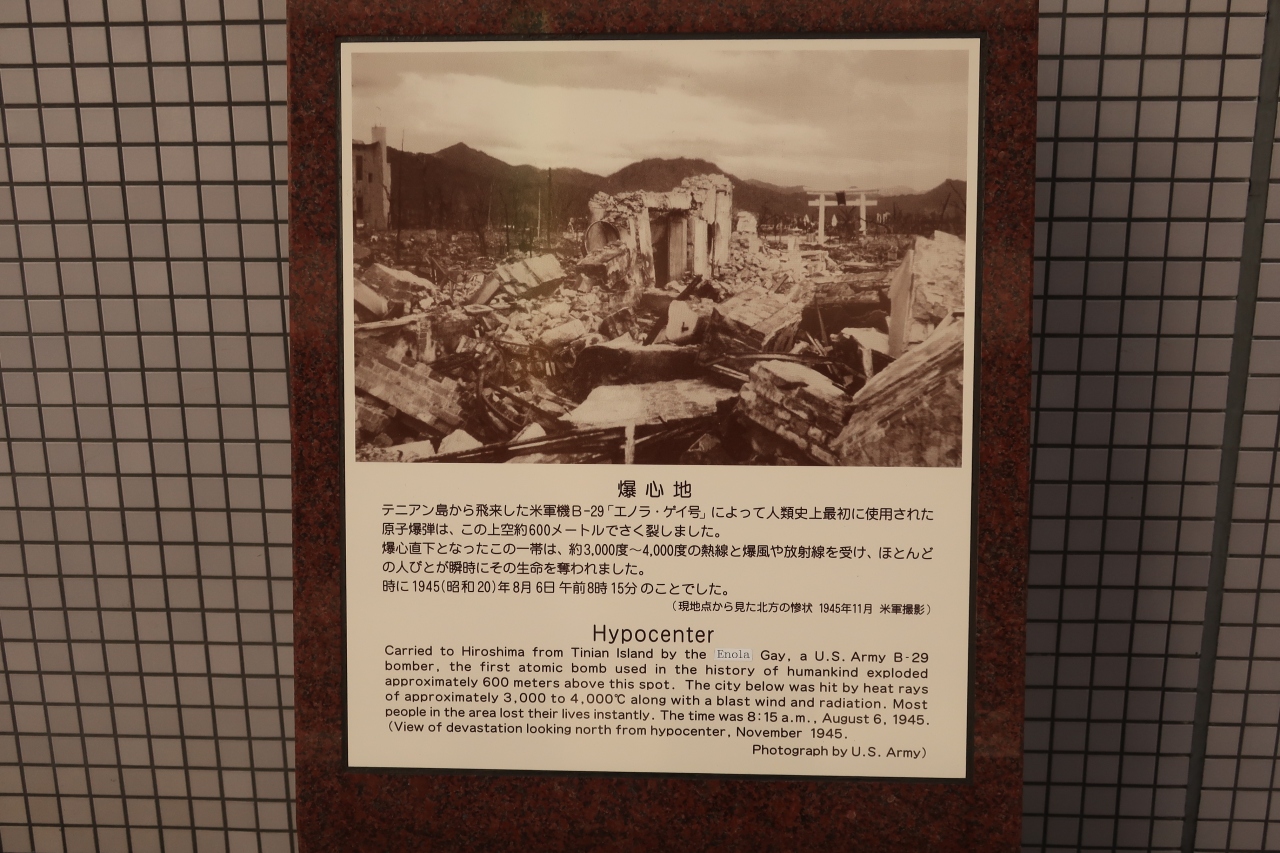 原爆ドームから公園を外れ、東側にしばらく歩いたオフィス街に爆心地はある。ここの上空で原子力爆弾がさく裂したことから爆心地と認定されている。現地は今も病院で、案内板もなく、モニュメントがあることからそれとわかる程度だ。ただ、戦場でも何でもない街の上空で原爆がさく裂するなど、とても信じられないことがおきたのだとつくづく感じる。